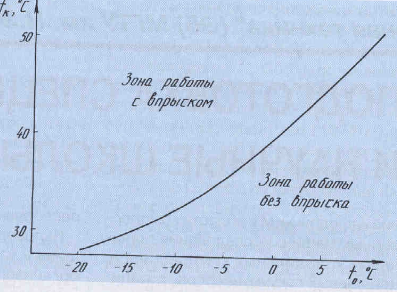 Рекомендуемые границы, определяющие зону работы компрессора с подачей жидкого хладагента, представлены на рис. 3. Из графика видно, что впрыск хладагента целесообразен при разностях температур кипения и конденсации более 40 °C.