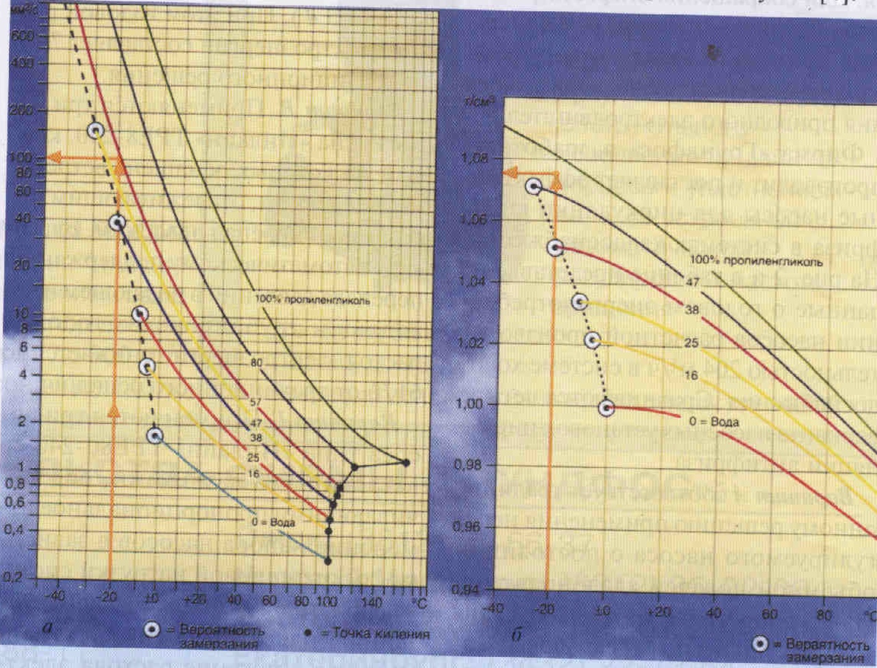 Стрелками на графиках показан пример определения свойств раствора с температурой —20 °C, состоящего из 57 % пропиленгликоля и 43 % дистиллированной воды. Раствор, подаваемый в воздухоохладители, не должен замерзать (рабочие точки на графике расположены правее линии замерзания).