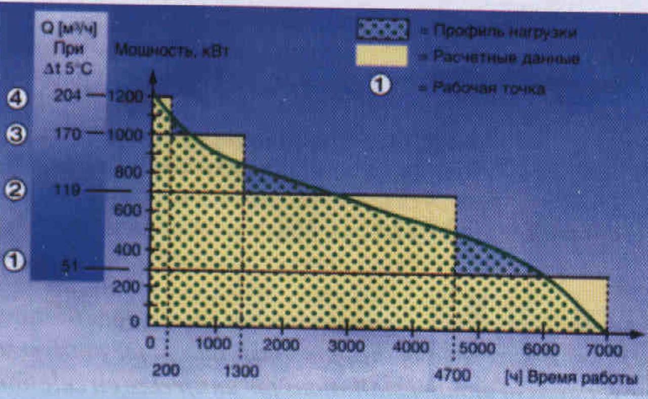 Рис. 2. График годового энергопотребления системы холодоснабжения с изменяющейся тепловой нагрузкой при расчетном расходе хладоносителя 204 лд/ч