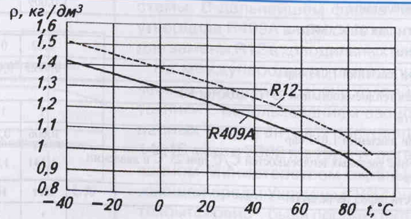 Плотность насыщенной жидкости R409A в диапазоне рабочих температур от -40 до +90 °С ниже плотности насыщенной жидкости R12 (рис. 2), что при ретрофите R12 позволяет: