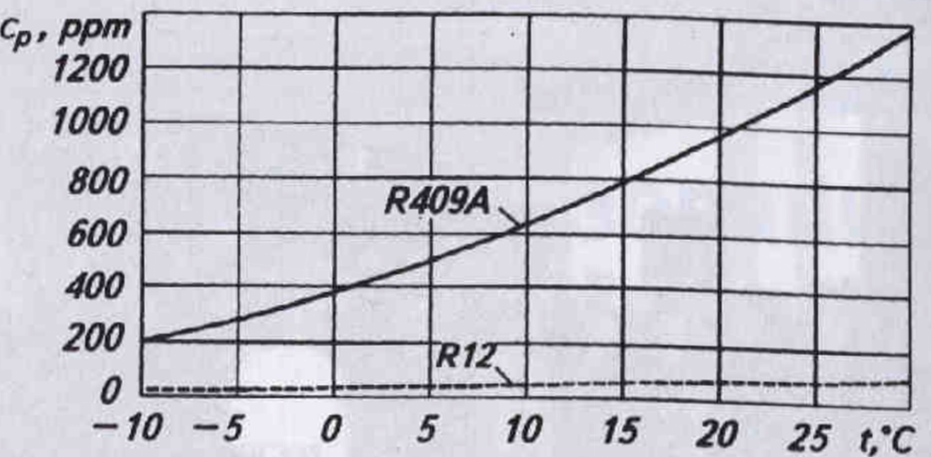 Для хладагента R409A характерна большая гигроскопичность по сравнению с R12 (рис. 3). Поэтому при ретрофите следует учитывать тенденцию R409A активно поглощать влагу из воздуха. Например, перед заправкой хладагентом холодильной системы ее следует обязательно вакуумировать. При заправке жидкого хладагента из емкости для хранения в заправочный баллон необходимо предварительно продуть хладагентом заправочные шланги. При условии соблюдения соответствующих мер предосторожности нормальная работа холодильной системы не нарушается.