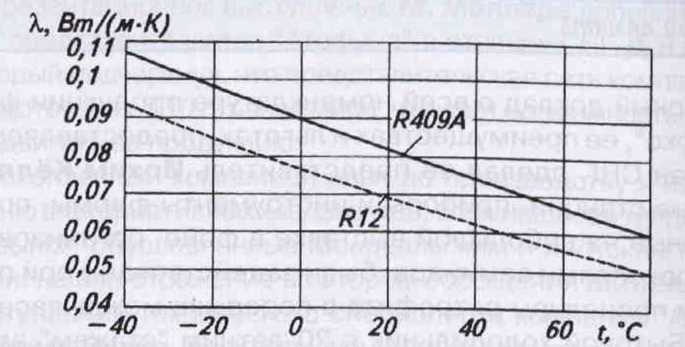 Коэффициент теплопроводности жидкого R409A в диапазоне рабочих температур в среднем на 14-22% выше, чему жидкого R12 (рис. 4). Это повышает эффективность теплообмена в аппаратах и приводит к снижению эксплуатационных затрат в холодильной системе.