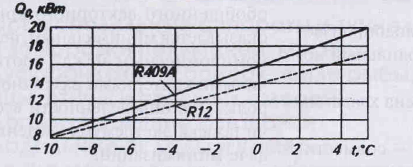При работе холодильной системы с хладоносителем холодопроизводительность на R409A в целом выше, чем на R12, а с повышением температуры, например, от -5 до +4 °С возрастает от 13 до 17% (рис. 5).