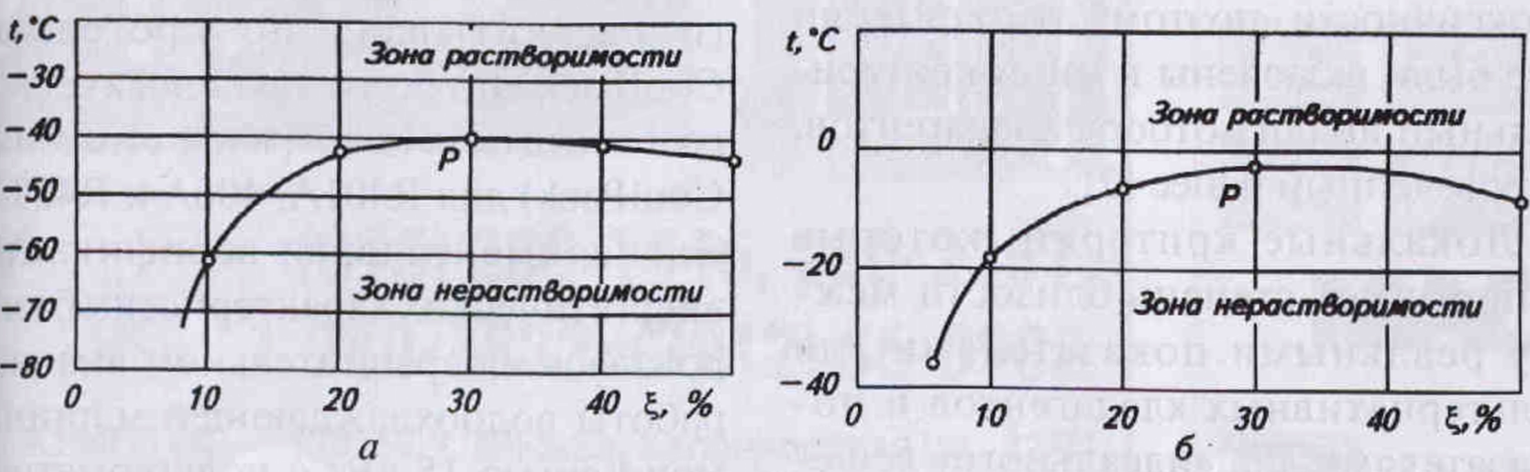 Рис. 6. Область растворимости R409A в маслах: а — алкилбензольных; б — минеральных; ξ - концентрация компонентов в %