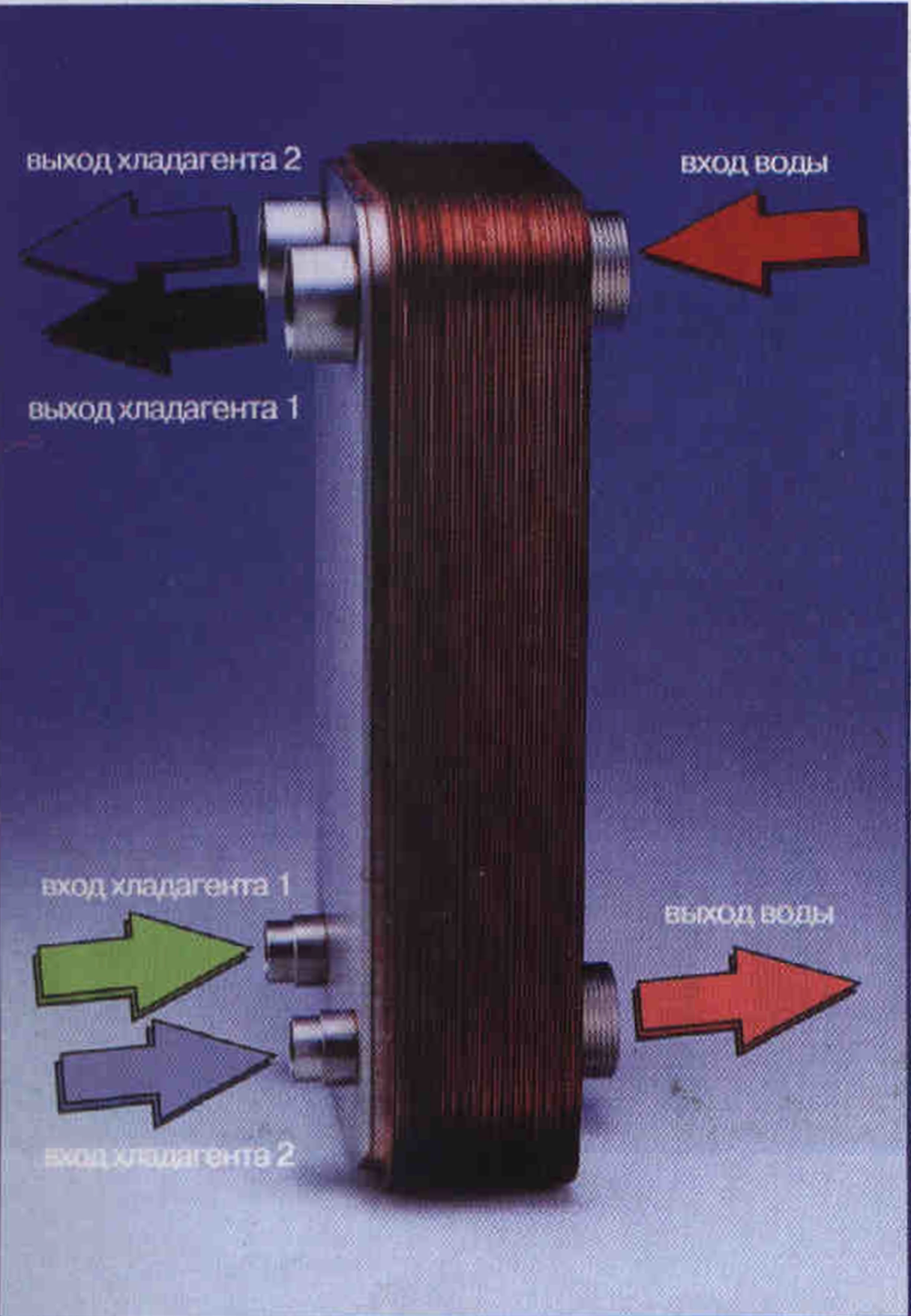 Diagonal Refrigerant flow - диагональное направление хладагента, что улучшает теплопередачу. В новых аппаратах можно использовать широкую гамму фреонов в качестве хладагентов, в том числе R407C, R404A, R410A.