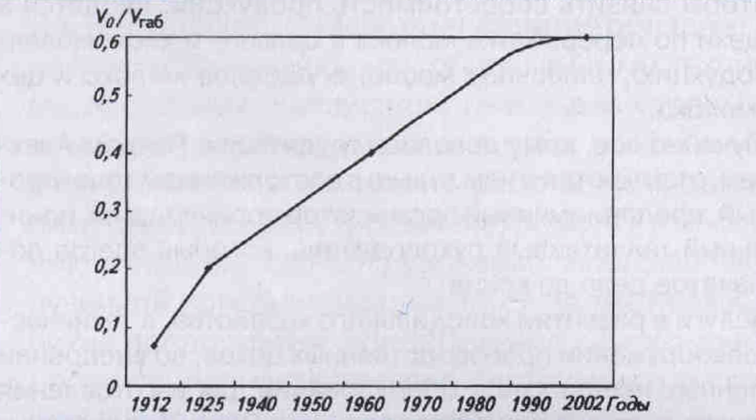 Совершенствование конструкций холодильников наглядно иллюстрируется динамикой коэффициента использования занимаемого пространства и отношения внутреннего объема Vо к габаритному Vгaб (рис. 1).