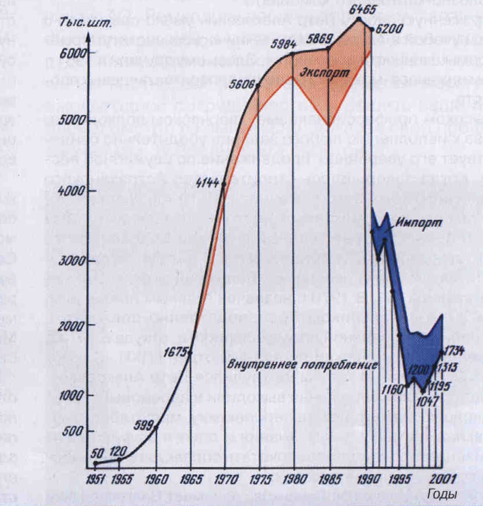 Освоение серийного производства первых отечественных холодильников началось сразу же после окончания второй мировой войны, сначала абсорбционных, а затем в 1951 г. и компрессионных. В 60-х годах были освоены холодильники второго поколения. С пуском новых производств были закрыты 11 мелких низкорентабельных предприятий. В 80-е годы объемы производства отечественных заводов превысили 6 млн шт. и страна вышла на второе место в мире после США. Отечественная промышленность не только полностью обеспечивала внутренние потребности, учитывающие необходимость в замене холодильников и рост новых семей, но и экспортировала в другие страны более 1 млн холодильников. Импорт холодильников в то время составлял менее 1% (рис. 3).