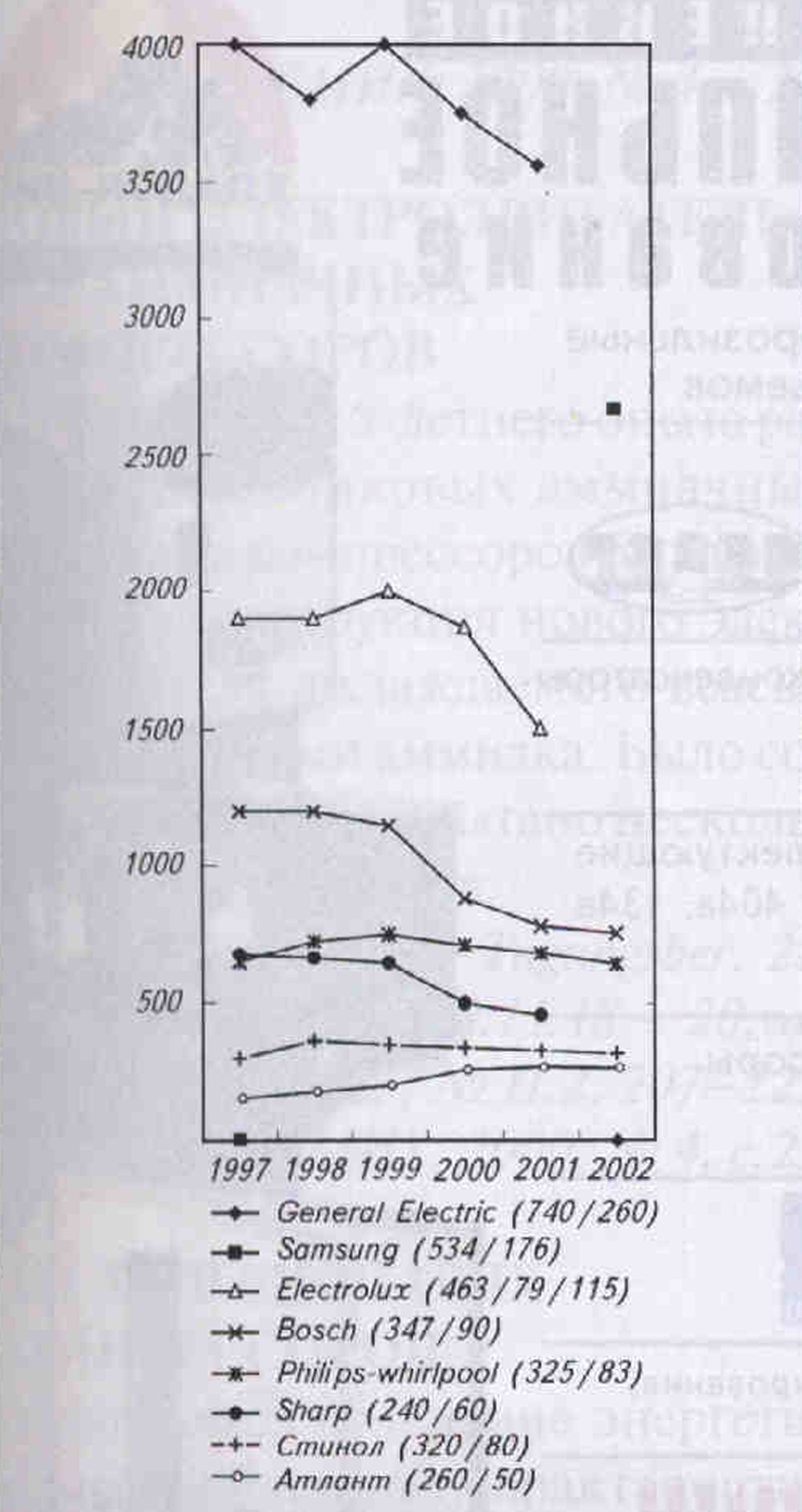 корейцы, несмотря на значительное сокращение ассортимента. Привлекательно смотрится распашной двухкамерный холодильник Samsung S20 с зеркальными дверями. Холодильник имеет встроенный бар и устройство для выдачи через дверь охлажденной воды и льда в кубиках или дробленом виде. Цена такого холодильника около 80 тыс. руб. Аналогичный холодильник General Electric год назад стоил около 150 тыс. руб.