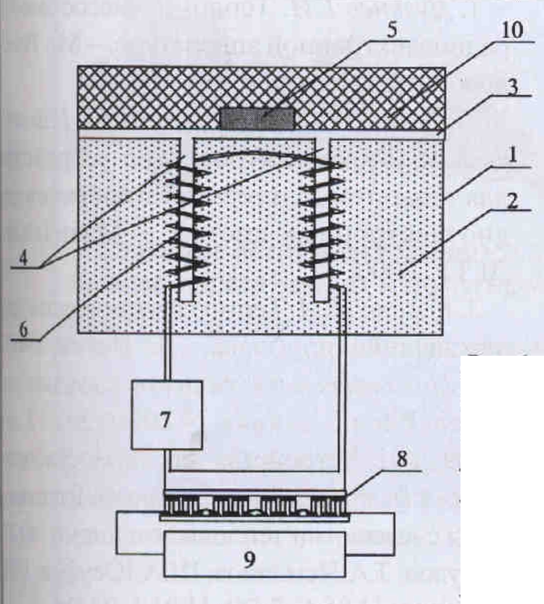 Для повышения точности термостабилизации радиоэлементов, уменьшения габаритных размеров и упрощения конструкции термостабилизатора предложено устройство, изображенное на рис.1 [2]. Оно содержит тонкостенный металлический контейнер 7 с плавящимся рабочим веществом 2. С внутренней стороны плоской поверхности крышки 3 контейнера расположены металлические штыри 4, погруженные в плавящееся рабочее вещество, а с внешней - элемент радиоэлектронной аппаратуры 5 и змеевик 6, представляющий собой тонкостенную металлическую трубку, по которой протекает охлаждающая жидкость. Часть змеевика, находящаяся в контейнере с плавящимся рабочим веществом, выполнена в форме спирали, окружающей металлические штыри крышки. Зазор между трубкой и штырем составляет 10... 15 мм. Течение жидкости по змеевику обеспечивает нагнетатель 7, охлаждение жидкости - термоэлектрическая батарея 8, питаемая от источника электроэнергии 9. Для снижения влияния температуры окружающей среды применяется теплоизоляция 10.