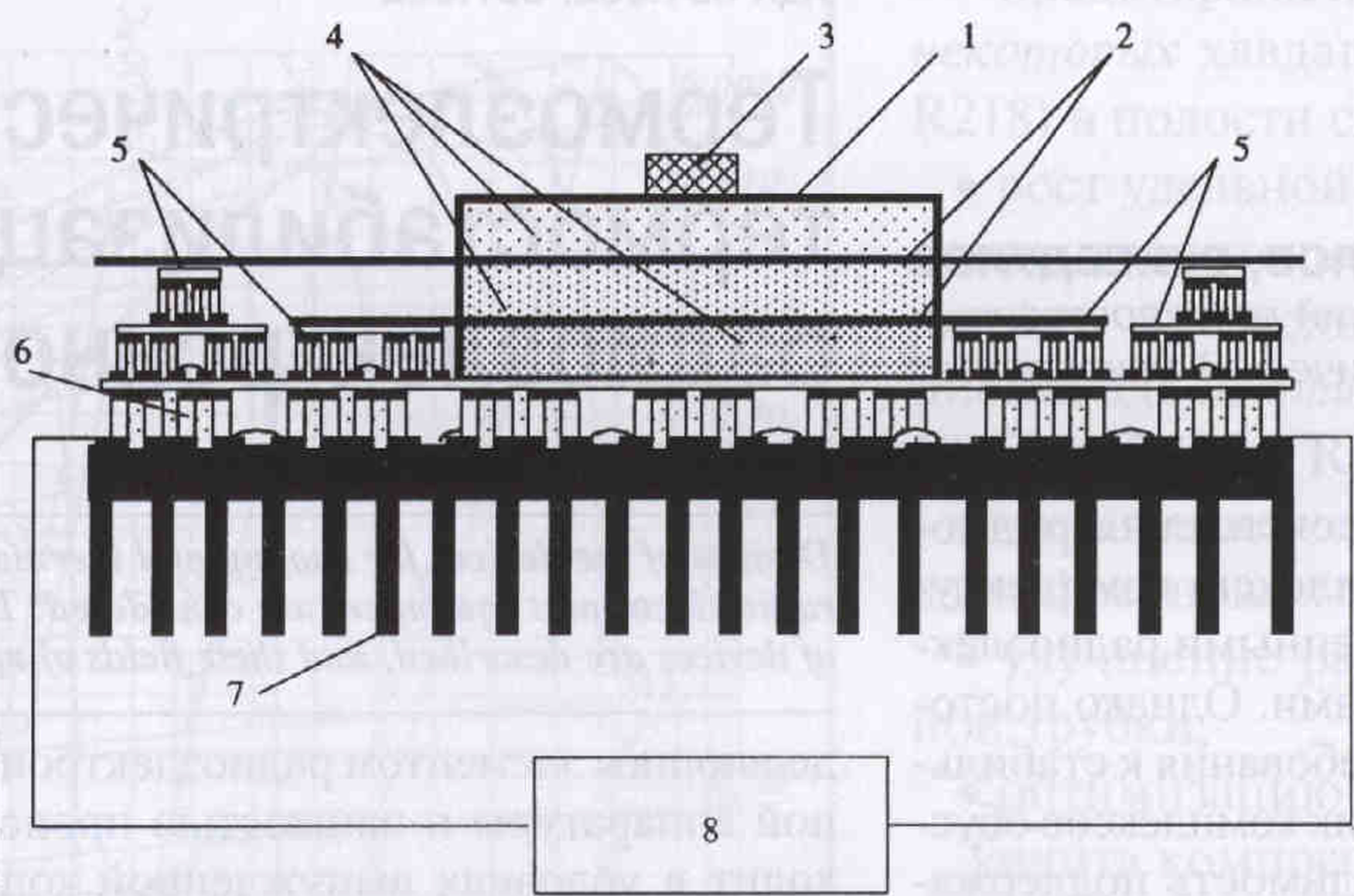 Теплота от радиоэлемента 3 передается металлической емкости 7, заполненной плавящимся наполнителем 4, который прогревается и плавится. Температура оболочки металлической емкости 7, разделенной металлическими перегородками 2, и соответственно радиоэлемента 3 не будет существенно возрастать по сравнению с температурой плавления наполнителя 4, находящегося в самом верхнем отсеке, пока существуют обе фазы (твердая и жидкая). После окончания цикла работы радиоэлемента 3 наполнители 4 остывают и затвердевают вследствие отвода теплоты каскадной; термоэлектрической батареей. Использование каскадной термоэлектрической батареи в предлагаемом исполнении позволит интенсифицировать процесс охлаждения и затвердеваний наполнителей 4. Основной теплоотвод от металлической емкости 7 с наполнителями 4 осуществляется базовым; каскадом 6 термоэлектрической батареи. Термоэлектрические модули 5, образующие верхние каскады термоэлектрической батареи, интенсифицируют процесс охлаждения наполнителей 4. Для отвода теплоты от тепловыделяющего спая каскадной термоэлектрической батареи используется радиатор 7. Питание каскадной термоэлектрической батареи осуществляется источником постоянного электрического тока 8.