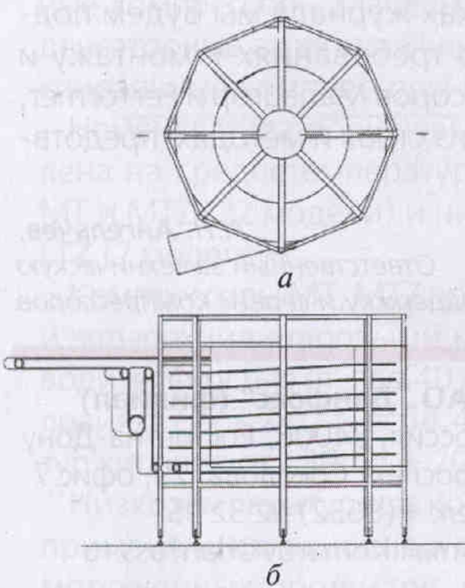 Спиральный конвейер: а—вид сверху; б— вид сбоку