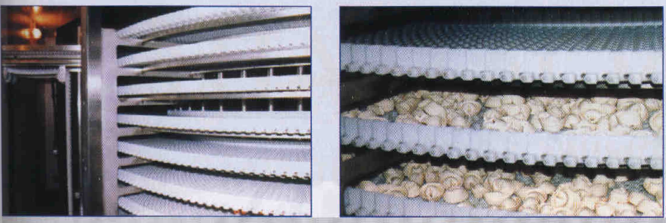 Применение спирального конвейера позволяет компактно расположить скороморозильный аппарат и технологическое оборудование в цехе, а также замораживать практически любой вид продукции, даже ручной работы (хинкали, манты, пельмени, блинчики, котлеты, люля-кебаб), так как в нем не происходит опрокидывания продукта при переходе с одного уровня на другой.