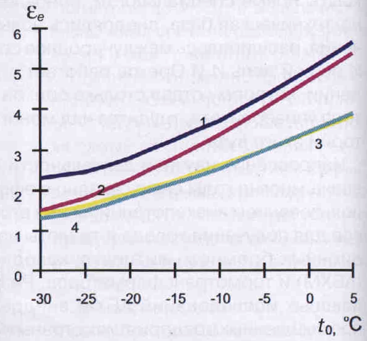 Pис. 1. Зависимость электрического холодильного коэффициента ε действительных циклов холодильных машин, работающих на различных хладагенmax, от температуры кипения t0 при tк=30°С для: 1 — R717(AB-22); 2 — R22 (5ПБ20-2-024); 3 — R12 (2ФУУБС25); 4 — R134a (МКТ20-2-0)