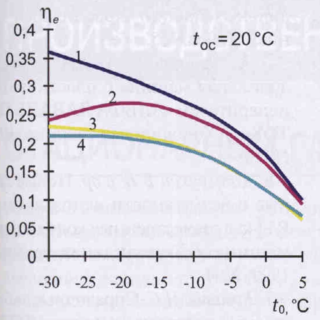 3. Fig. 2. Dependence of exergic efficiencies ηe of actual cycles of refrigerating machines on boiling point t0 of refrigerants: 1 - R717 (АV-22); 2 - R22 (5PB20-2-024); 3 - R12 (2FUUBS25); 4 - R134a (МКТ20-2-0)