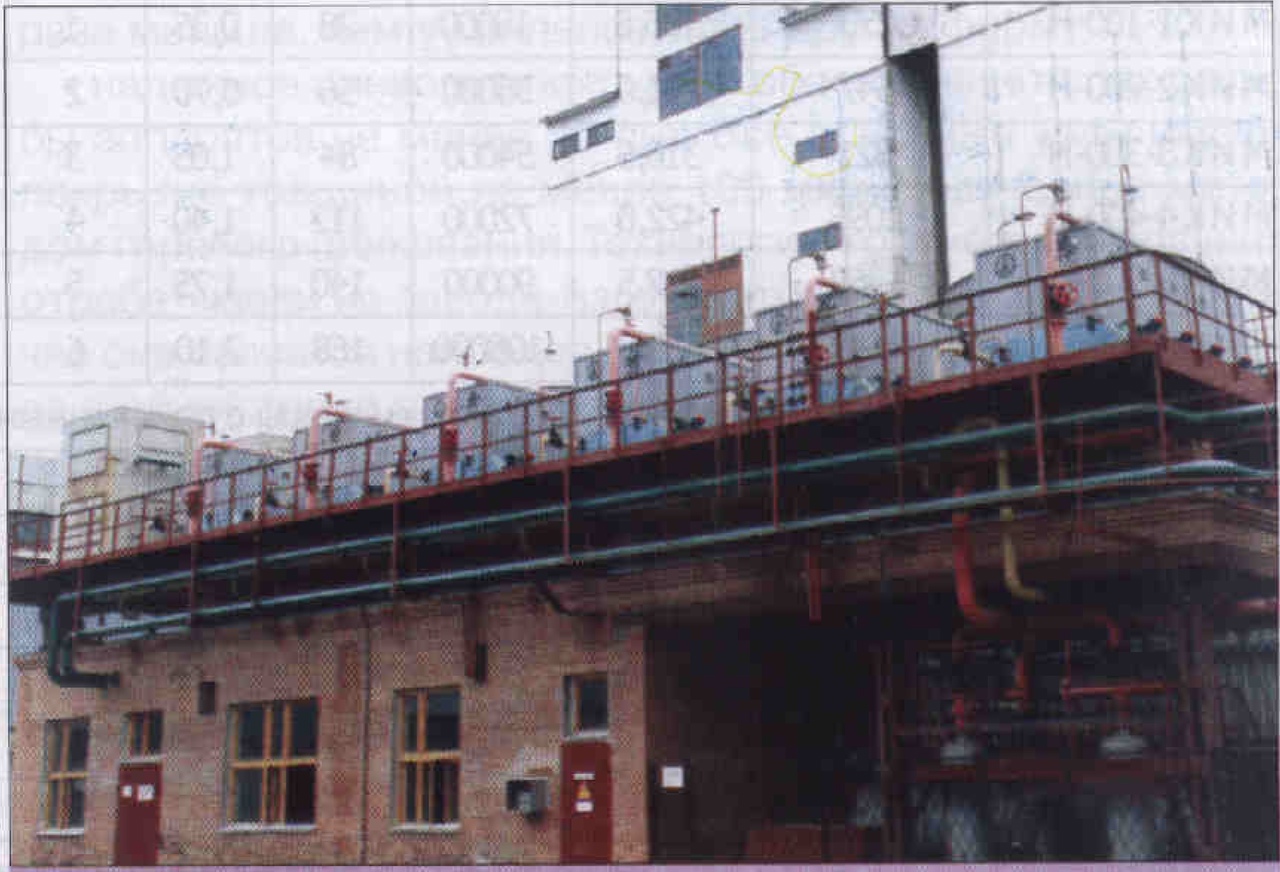 Конденсаторное отделение Ульяновского пивзавода «Витязь*, оборудованное шестью испарительными конденсаторами