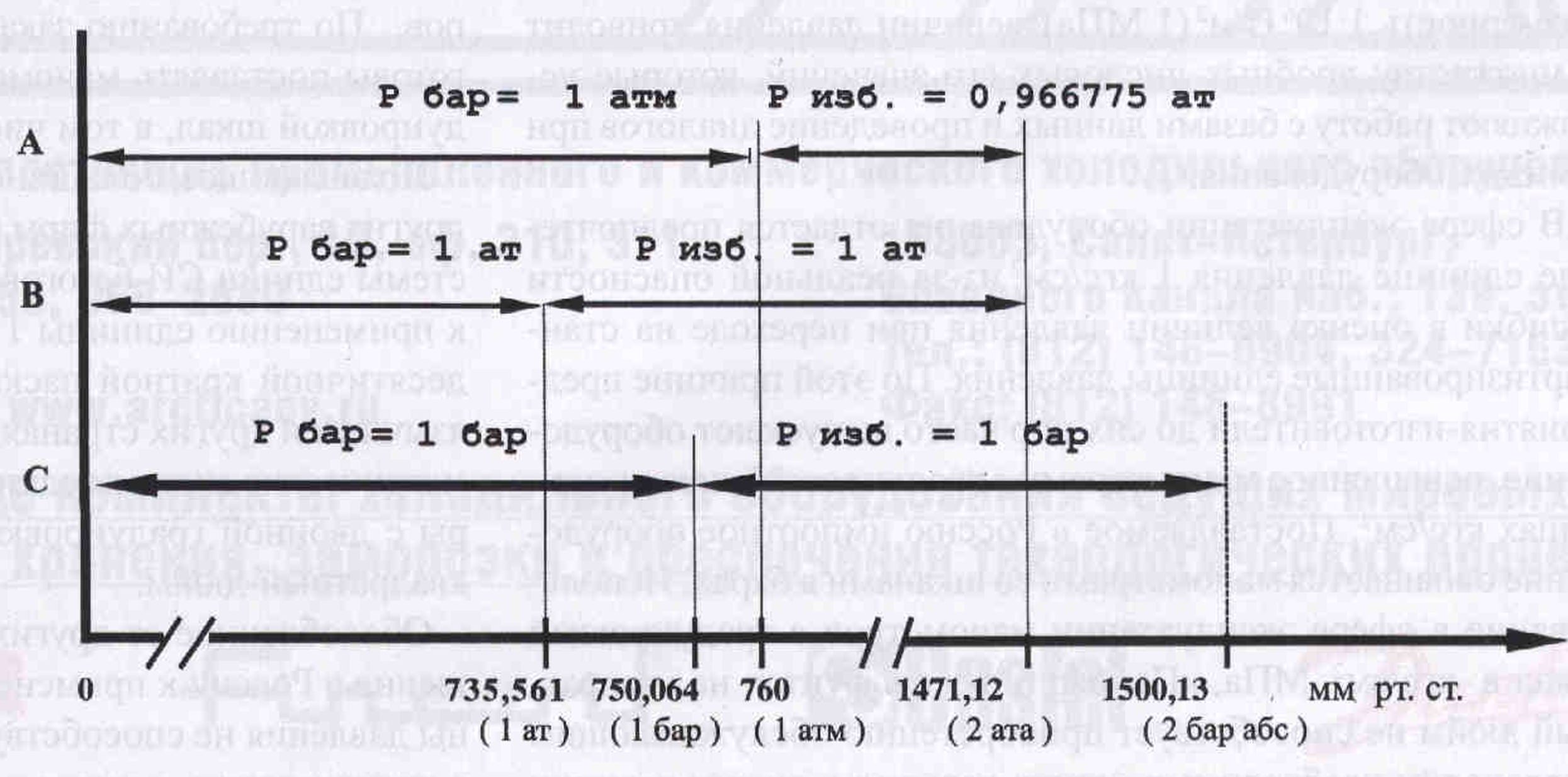 Численный пример влияния выбираемого значения барометрического давления на значение избыточного давления при заданном для расчета оборудования абсолютном значении давления: А — выбор барометрического давления 1 атм = 760 мм рт. ст. при заданном абсолютном давлении 2 ата. В — выбор барометрического давления 1 ат = 735,561 мм рт. ст. при заданном абс. давлении 2 ата. С — выбор барометрического давления 1 бар = 750,064 мм рт. ст. при заданном абс. давлении 2 бар абс. Примечание. Среднегодовое значение барометрического давления в Москве составляет 750 мм рт. ст.