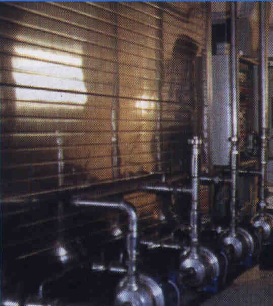 На рис. 1 показано бродильное отделение, где установлено несколько резервуаров сливом, в которых поддерживается температура на уровне -3 °С. При этом подача и равномерное распределение хладоносителя из льдоаккумуляторов для охлаждения баков с пивом обеспечиваются насосной станцией, включающей 4 центробежных насоса (рис. 2).