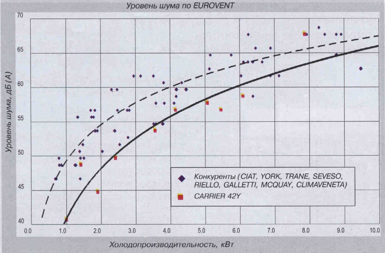 Благодаря применению новейших исследований аэродинамики компании Carrier удалось добиться лучших показателей по уровням шума среди всех мировых производителей. Модели 42Y имеют уровень шума от 3 до 10 дБ(А), что ниже, чем у ведущих компаний-производителей аналогичных вентиляторных доводчиков. Эти характеристики были подтверждены независимой экспертизой Eurovent.