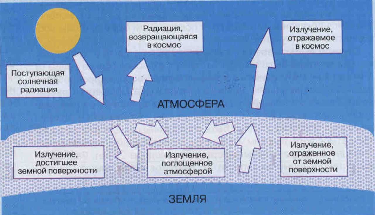 Этот вопрос стал главным, когда возникла реакция на информацию о разрушении озонового слоя. Сейчас вопросы глобального потепления и разрушения озонового слоя объединяют в общую проблему. Глобальное потепление возникает вследствие «парникового эффекта» (рис. 1). Распределение частот в солнечном излучении близко к излучению абсолютно черного тела при температуре около 5800 К. Спектр частот находится в интервале от 10 9 м до сотен мет ров, максимум лежит в области около 500* 109 м, в интервале видимой части спектра. Около 30 % солнечной радиации (1360 Вт/м2), прошедшей через атмосферу, отражается в космическое пространство, а остальная часть достигает земной поверхности. Она нагревает Землю, которую в данном случае можно рассматривать как абсолютно черное тело, испускающее инфракрасное излучение, кото рое не может пройти через атмосферу, так как поглощается парами воды, диоксидом углерода и другими его поглотителями. В результате тепловой поток попадает в ловушку, и температура на поверхности Земли устанавливается более высокой, чем она была бы без изолирующего слоя атмосферы.