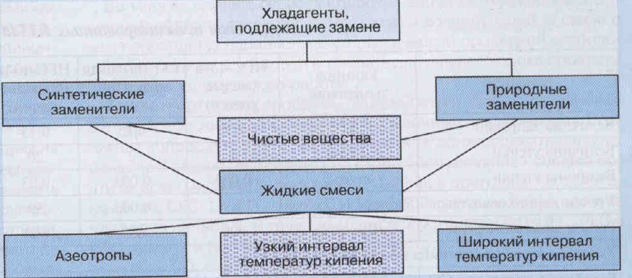Теперь хорошо известны меры, принимаемые для сохранения озонового слоя. Постепенно соединения типа CFC должны быть изъяты из применения, за ними должны последовать соединения типа HCFC. Ведется значительная работа, направленная на замену этих хладагентов другими, отвечающими озоносберегающим требованиям, и на преодоление смежных задач, включающих ретрофит. Проблемы возникают также в связи с изменениями КПД и производительности, потерей температурного уровня, трудностями с маслами и их совместимостью с хладагентами. Часть из них пре одолена, но многие еще остались. Нелегальная торговля CFC может быть прекращена при решении этих проблем. Возможный альтернативный выбор хладагентов представлен на рис. 2. Некоторые варианты замены CFC и HCFC приведены в табл. 1, включающей как смеси хладагентов, так и природные вещества. Потенциальные альтернативные рабочие вещества включают три вида углеводородов (два фторированных классов HFC, PFC и один, не со держащий фтора, НС), а также диоксид углерода СО2, аммиак NH.; и воздух. Соединения типа PFC едва ли смогут играть существенную роль, поскольку имеют очень высокий потенциал глобального потепления и длительный срок существования в атмосфере. Хладагенты типа HFC также включены в Киотское соглашение, как подлежащие выведению из употребления.