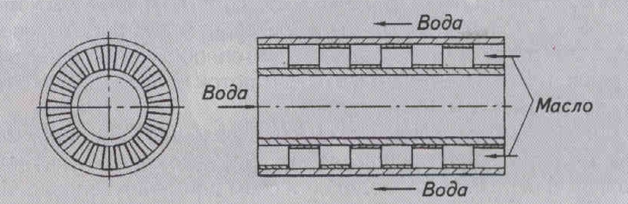 Теплообменные элементы маслоохладителя МОХ (рис.1) представляют собой коаксиально расположенные трубы, образующие кольцевые каналы [1]. Каналы заполнены насад кой (развитая поверхность теплообмена),играющей роль оребрения и турбулизатора. Плотное прилегание насадки к трубам обеспечено натягом. Движение теплоносителей прямоточно-противоточное (масло - между трубами по насадке, вода - внутри внутренних труб и снаружи наружных).