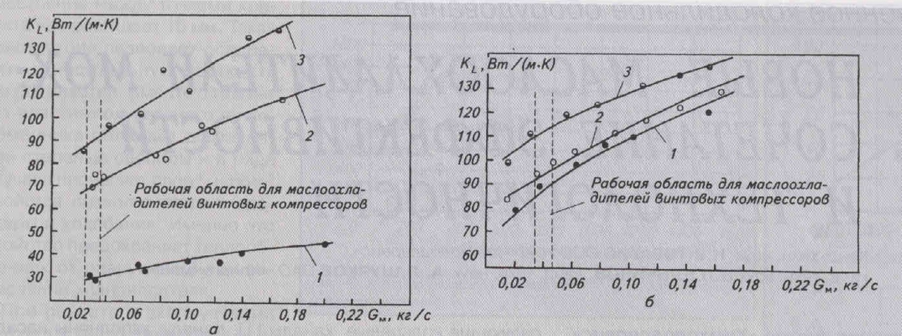 Рис. 2. Зависимость коэффициента теплопередачи Kt от массового расхода масла G в маслоохладителях с силой натяга 100 Н (а) и 3000 Н (б): 1 — вода внутри: 2 — вода снаружи; 3 вода внутри и снаружи