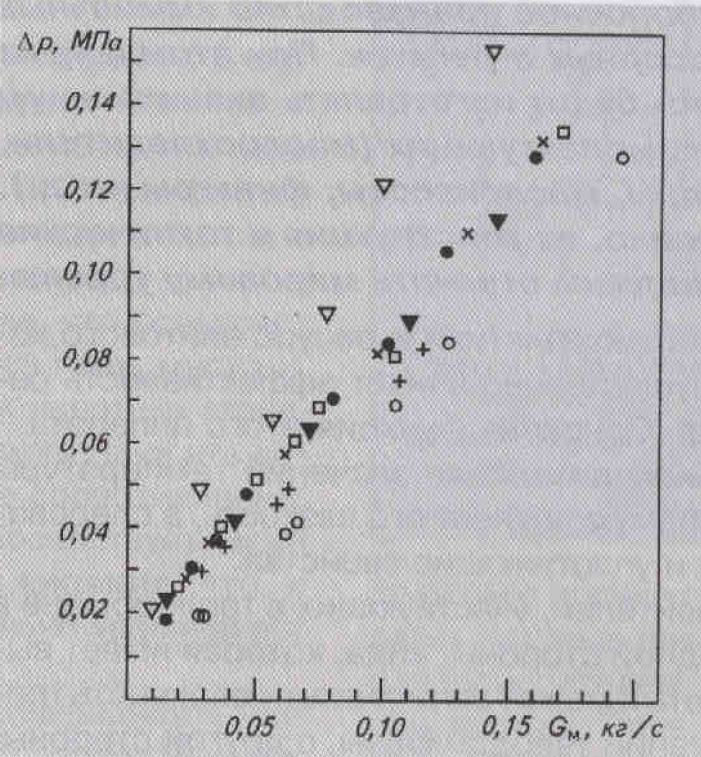 Рис. 3. Зависимость гидравлического сопротивления Др маслоохладителей от массового расхода масла 6 и при различных силах натяга и схемах движения воды (обозначения схем см. рис. 2): о 100 Н (схема 1); + — 100 Н (схема 2); □ — 100 Н (схема 3); • - 300 Н (схема 1); х — 3000 Н (схема 2) ; V - 3000 П (схема 3)