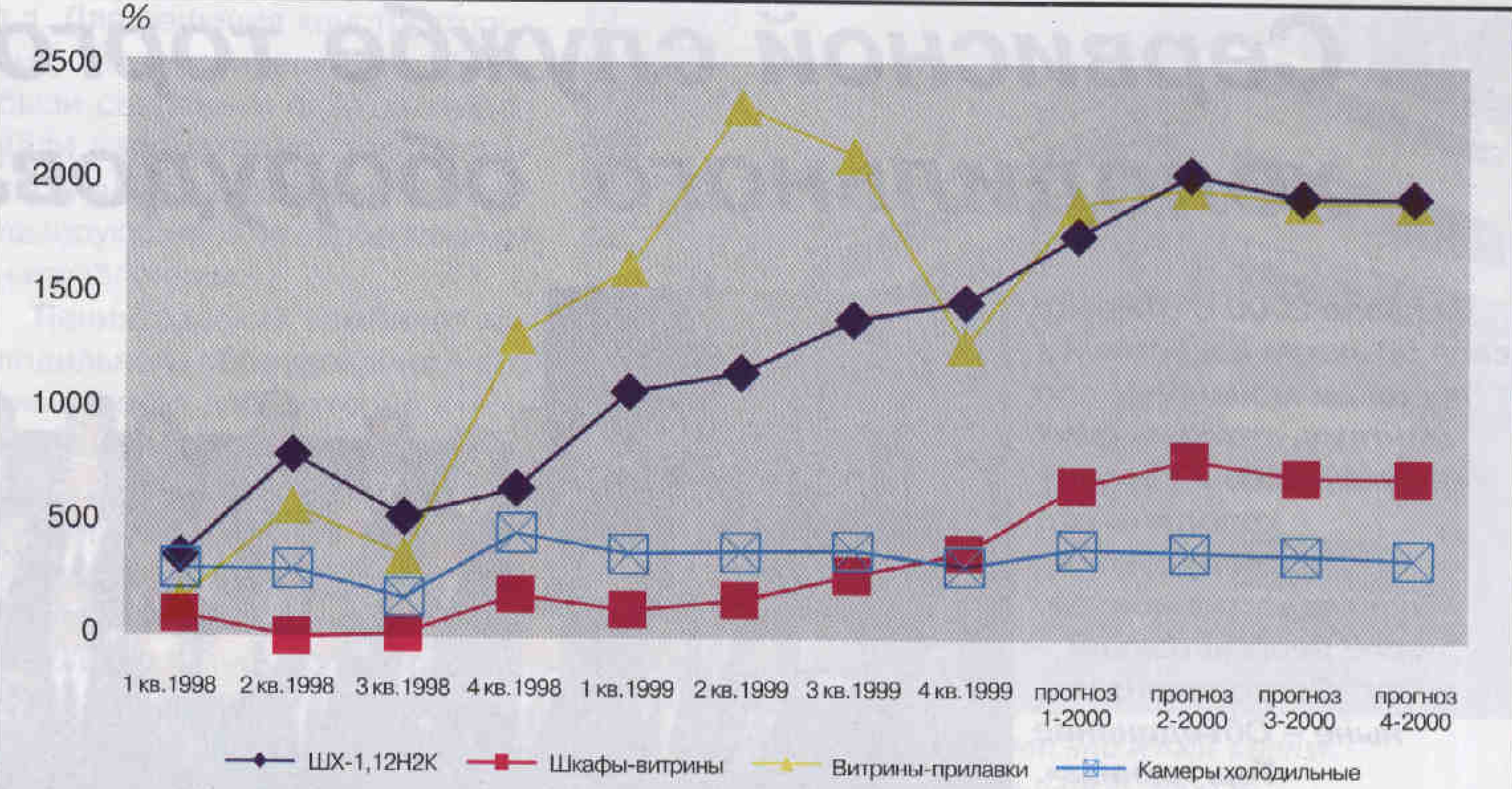 Таким образом был сформирован задел, и после девальвации рубля в августе 1998 г., повлекшей за собой повышение спроса на отечественное оборудование, начался постепенный рост объемов производства (рис. 1). Это дало возможность увеличить выпуск шкафов ШХ-1.12Н2К и финансировать разработки прилавков-витрин повой серии (рис. 2), осуществляемые заводом.