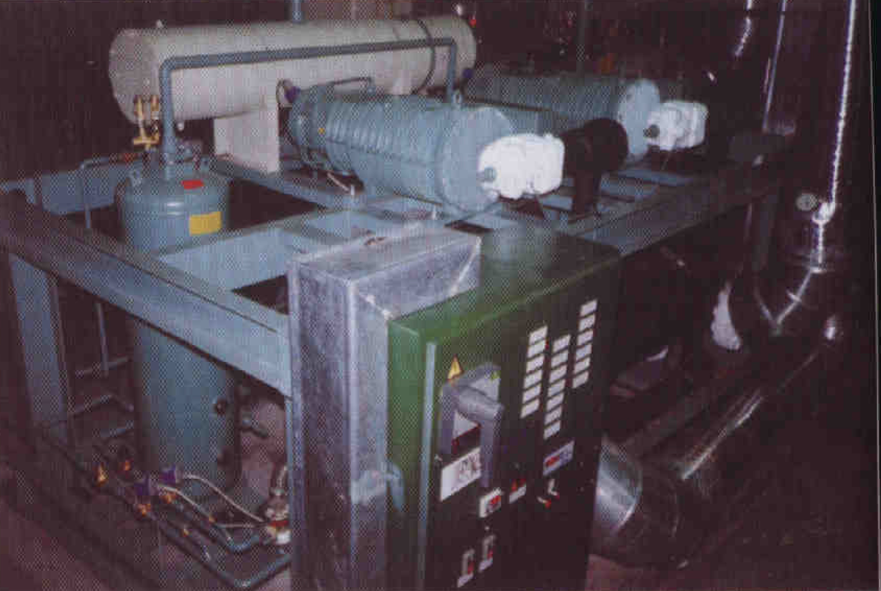 Установка состоит из двух винтовых компрессоров HSN 7471-75 (фирма BITZER), кожухотрубных конденсатора, испарителя (фирма FRIGA-BOHN) и маслоохладителя, собранных в виде моноблока на единой раме.