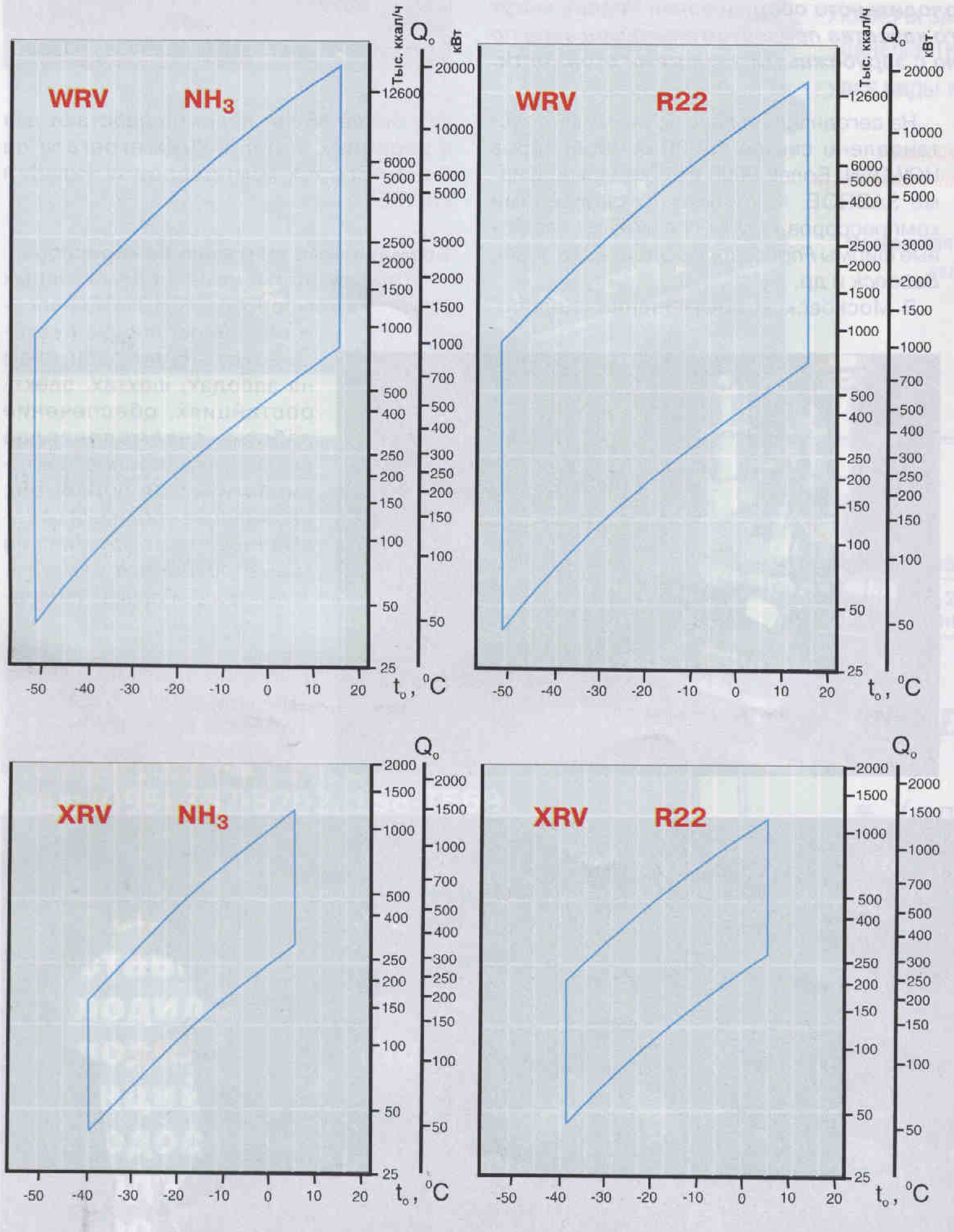 На диаграммах приведены диапазоны холодопроизводительности Qo в зависимости от температуры кипения t0 для компрессоров WRV и XRV.