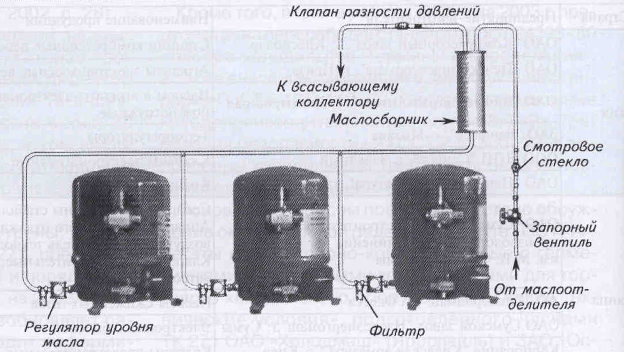 На всю систему приходится один общий МО, а каждый компрессор имеет свой РУМ, который устанавливают на месте крепления смотрового стекла. Масло из МО поступает в маслосборник (MC) и затем через РУМ в компрессор.