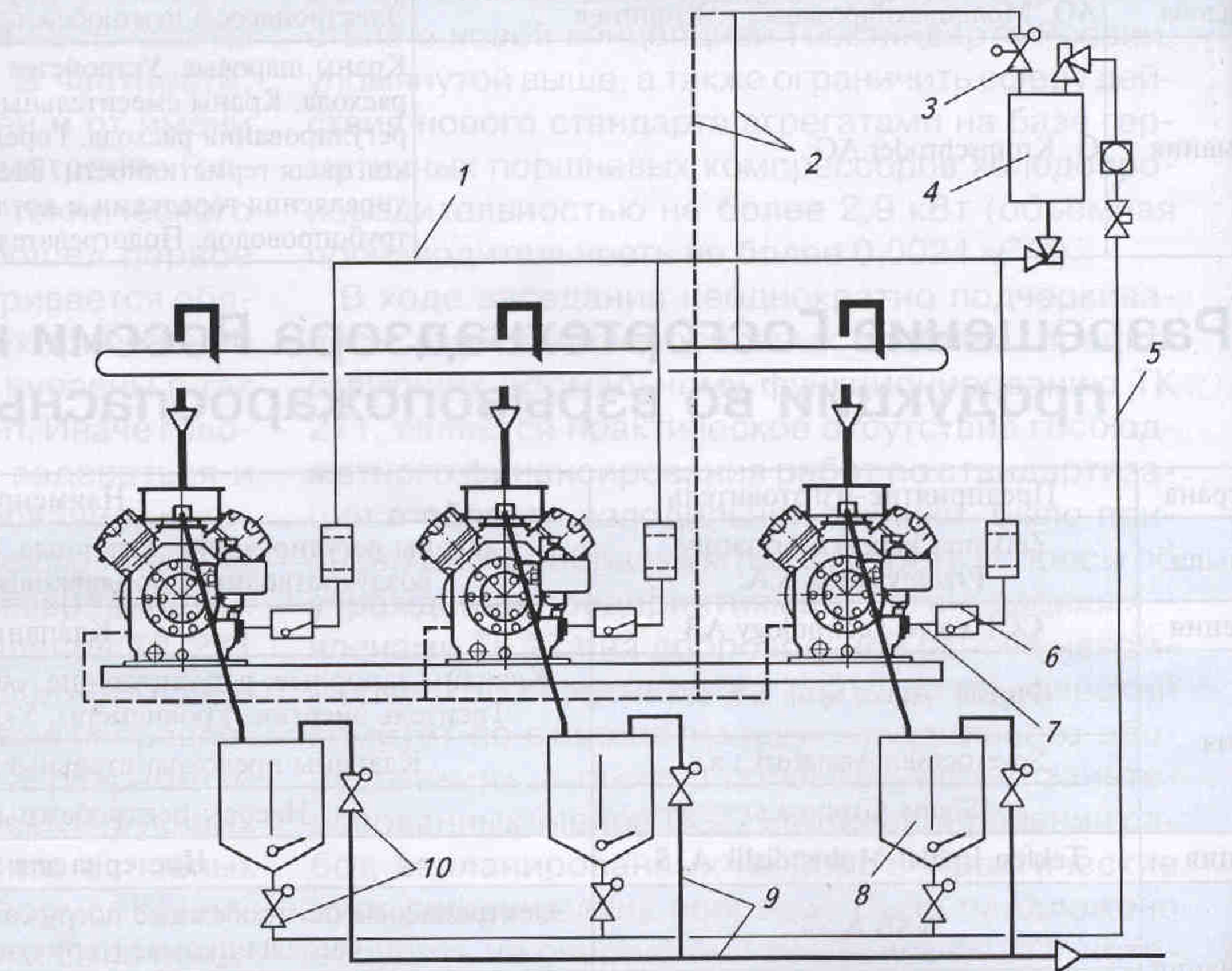 Рис. 2. Многокомпрессорный холодильный агрегат с регуляторами уровня масла: 1 — маслопровод; 2 — линия сброса давления; 3 — дифференциальный клапан давления; 4 — маслосборник (MC); 5 — линия возврата масла; 6 — регулятор уровня масла (РУМ); 7 — присоединительный переходник; 8 — маслоотделитель (МО); 9 — линия нагнетания; 10 — обратный клапан