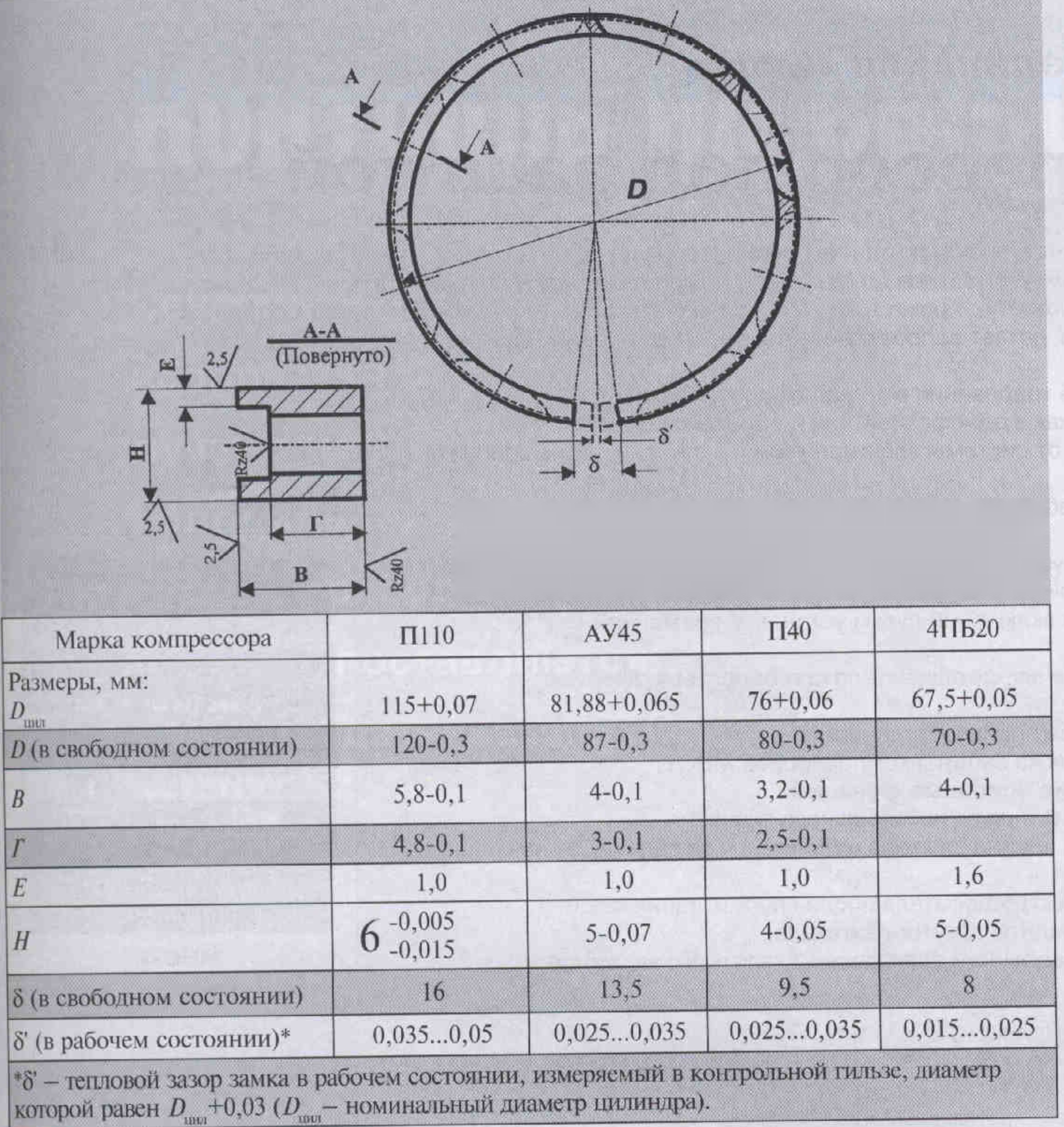 *8 — тепловой зазор замка в рабочем состоянии, измеряемый в контрольной гильзе, диаметр которой равен Д+0,03 (Dцил— номинальный диаметр цилиндра). | ||||