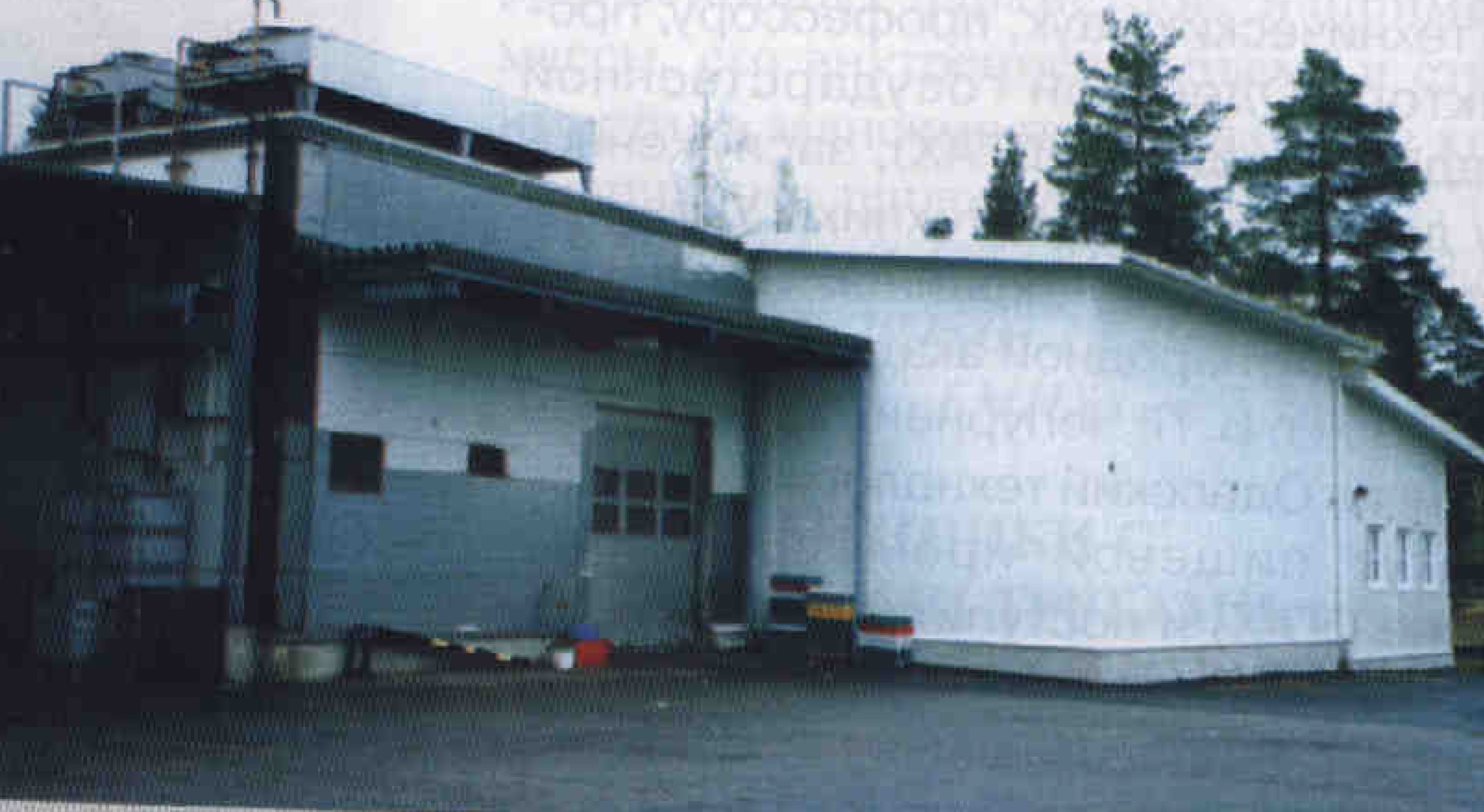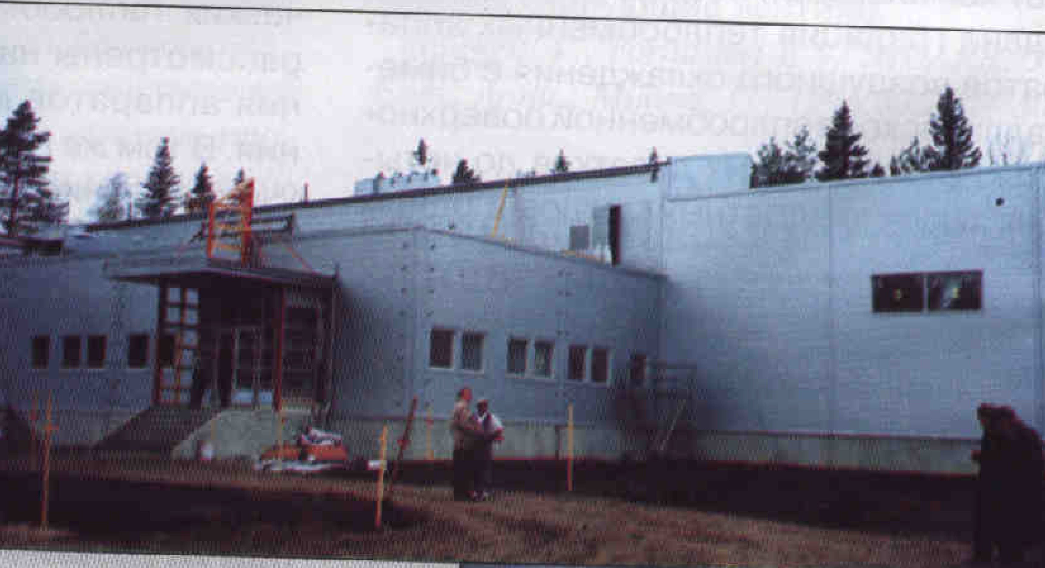 Фабрика по переработке птицы в г. Юва, находящаяся в завершающей стадии строительства, представлена на фото 3,4. Здание фабрики собрано из панелей ИЗОРА, за исключением межкомнатных перегородок в офисной части. Наружные стены и кровля смонтированы из панелей толщиной 150 мм, морозильные камеры - 175 мм, подвес ной потолок и перегородки между помещениями - 80 и 52 мм. В технологических помещениях использовались панели, облицованные кислотоупорной сталью. Монтаж панелей, общая площадь которых 5500 м2, выполнен за 4 мес.