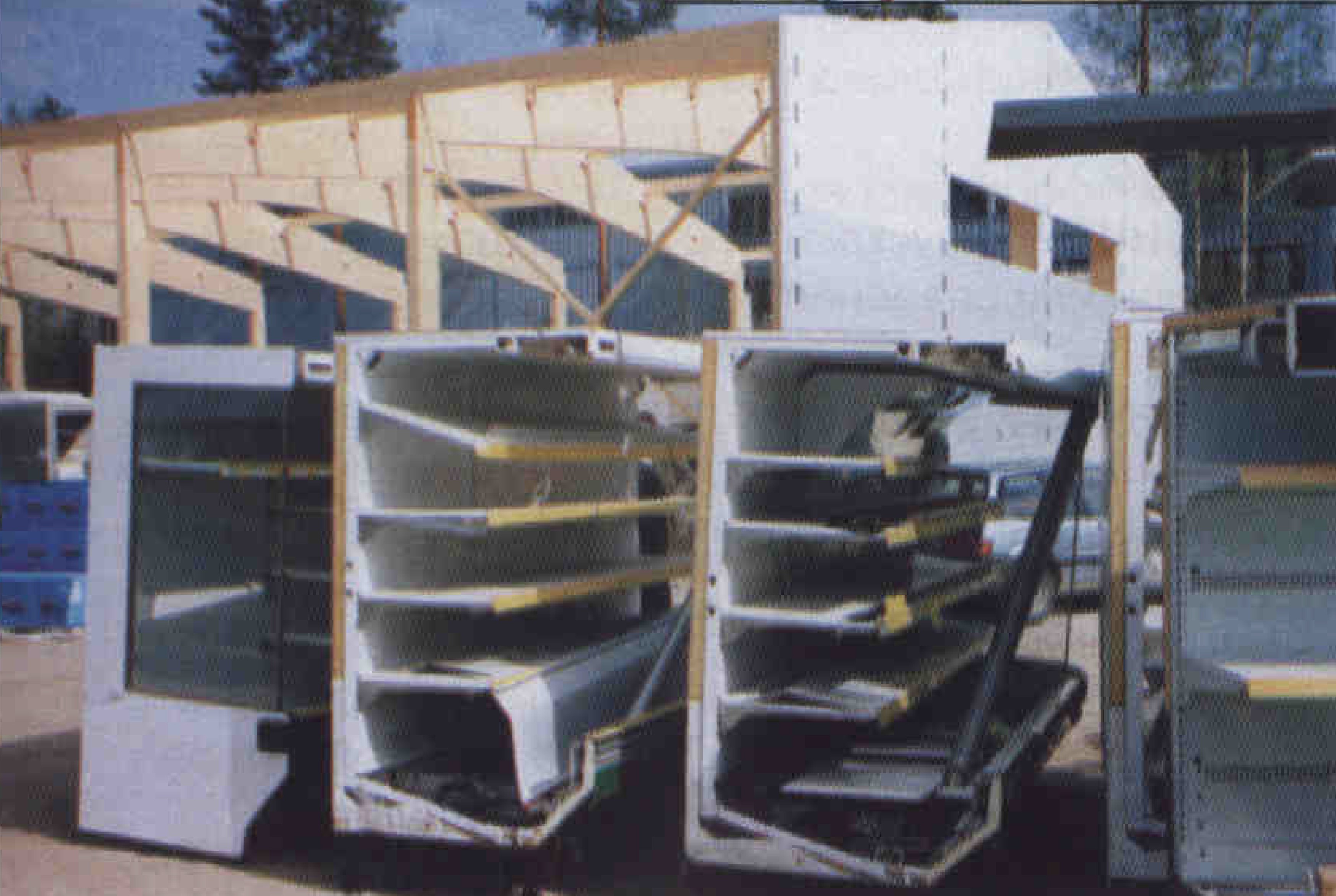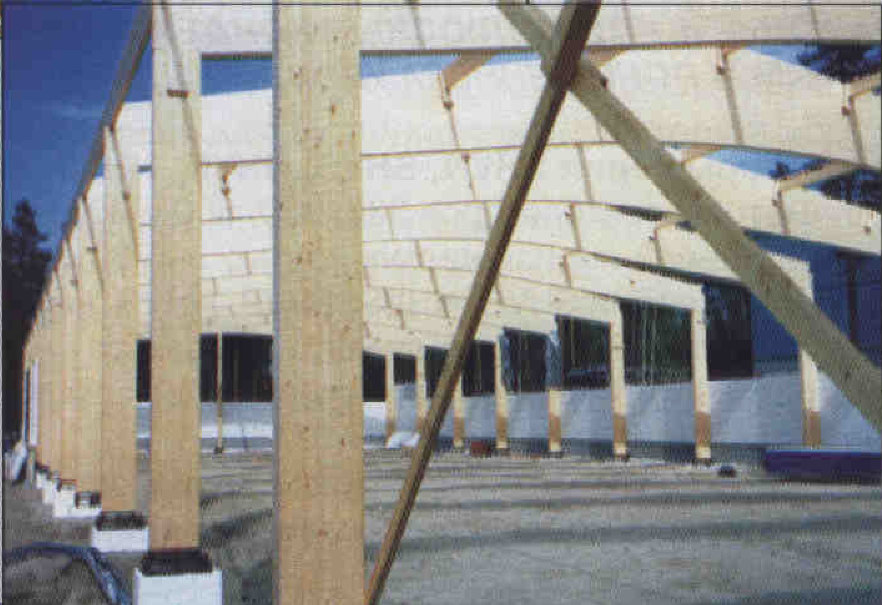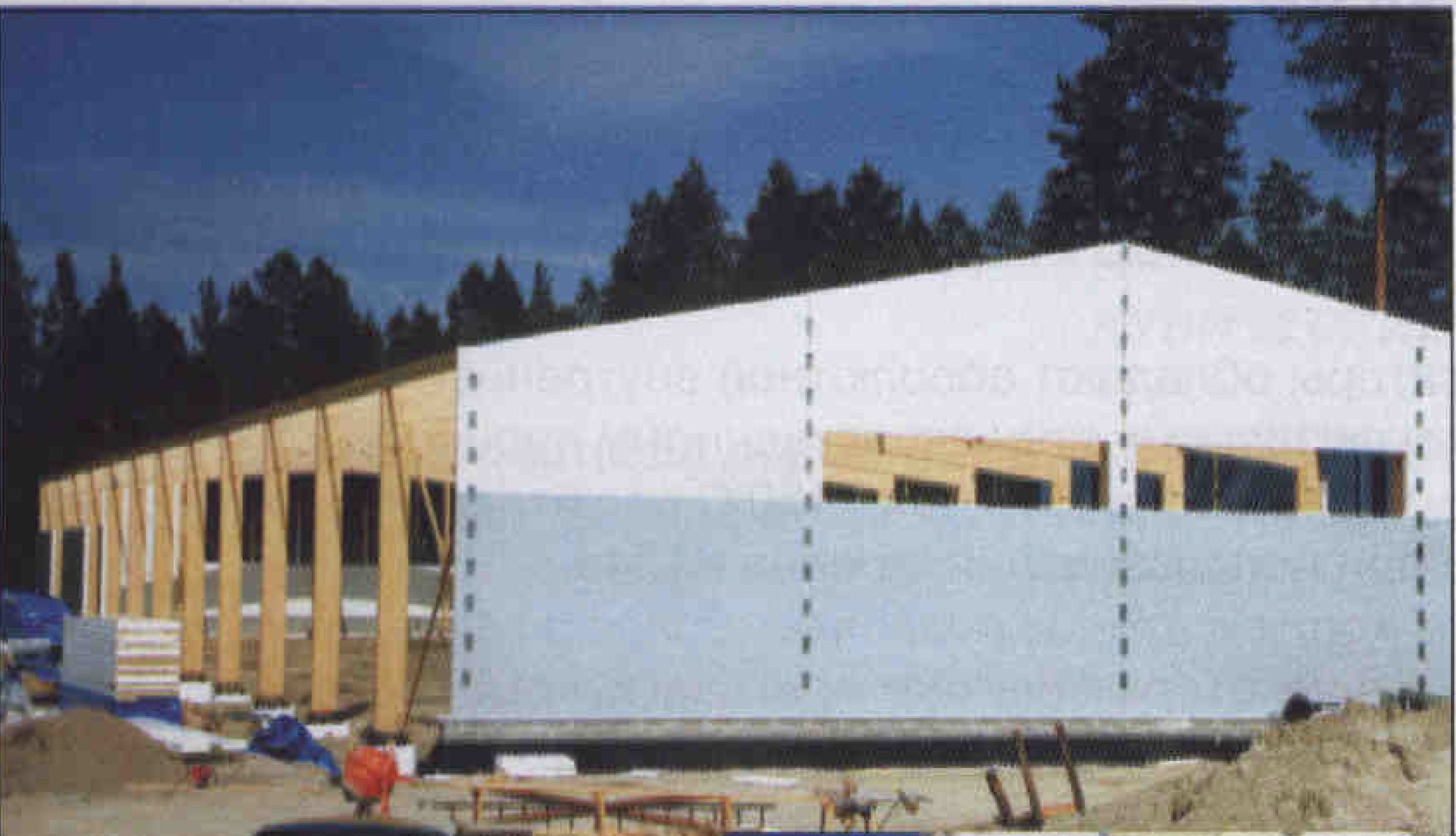 В г. Ювескюля участники поездки посетили строящийся цех завода по восстановлению бывшего в употреблении торгового холодильного оборудования (фото 5 - 7). Площадь цеха 1550 м2. Каркас здания выполнен из клееных деревянных блоков, имеющих огнеупорную пропитку (см. фото 6). По словам г-на Р. Миккола, такой каркас дешевле сталь ного или железобетонного. Панели ИЗОРА крепятся к каркасу шурупами. Монтаж панелей ведет бри гада из трех человек, один из которых управляет подъемным механизмом. Для гидро- и теплоизоляции фундамента по периметру здания на глуби не 0,5 м под землей уложена наклонная отмостка из экструзионного полистирола.