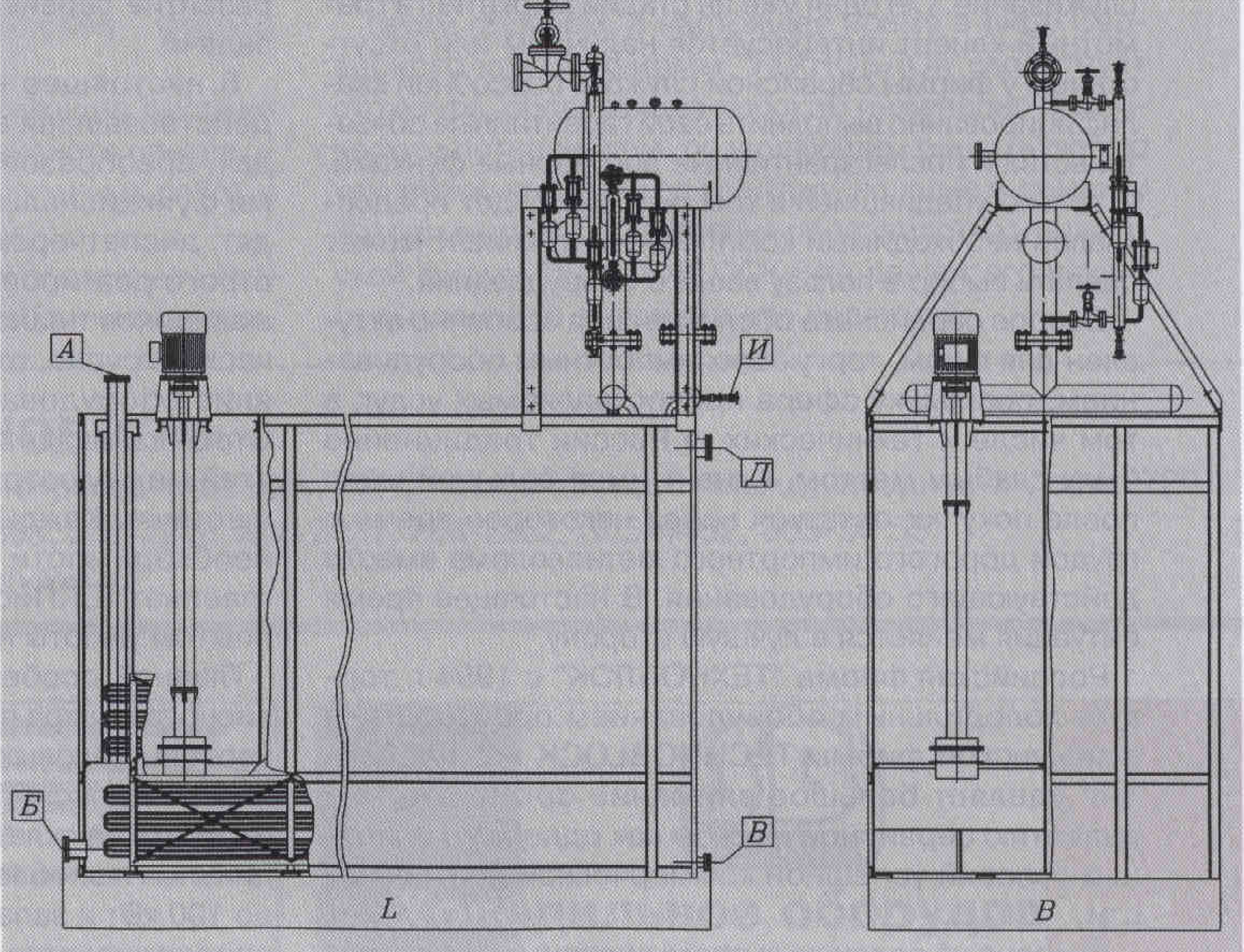 Внутри бак разделен перегородками на три основных, со общающихся между собой отсека. В двух продольных отсеках расположены теплообменные модули (зона охлаждения), в третьем - вертикальные осе вые насосы, создающие необходимый напор для циркуляции воды в зоне охлаждения с заданной скоростью.