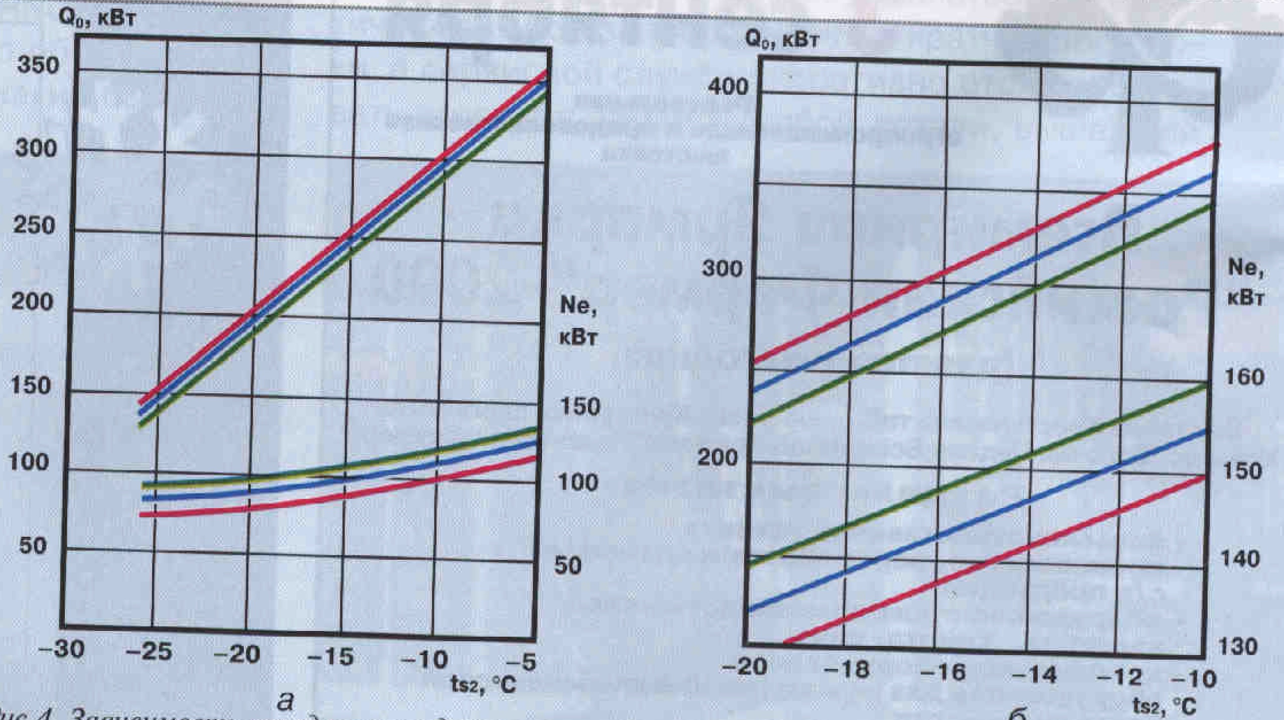 5. Fig.4. Dependence of the cooling capacity Qo and power consumption Ne on the temperature of the refrigerant at the outlet of the evaporator t2 and the temperature of the cooling water at the inlet.