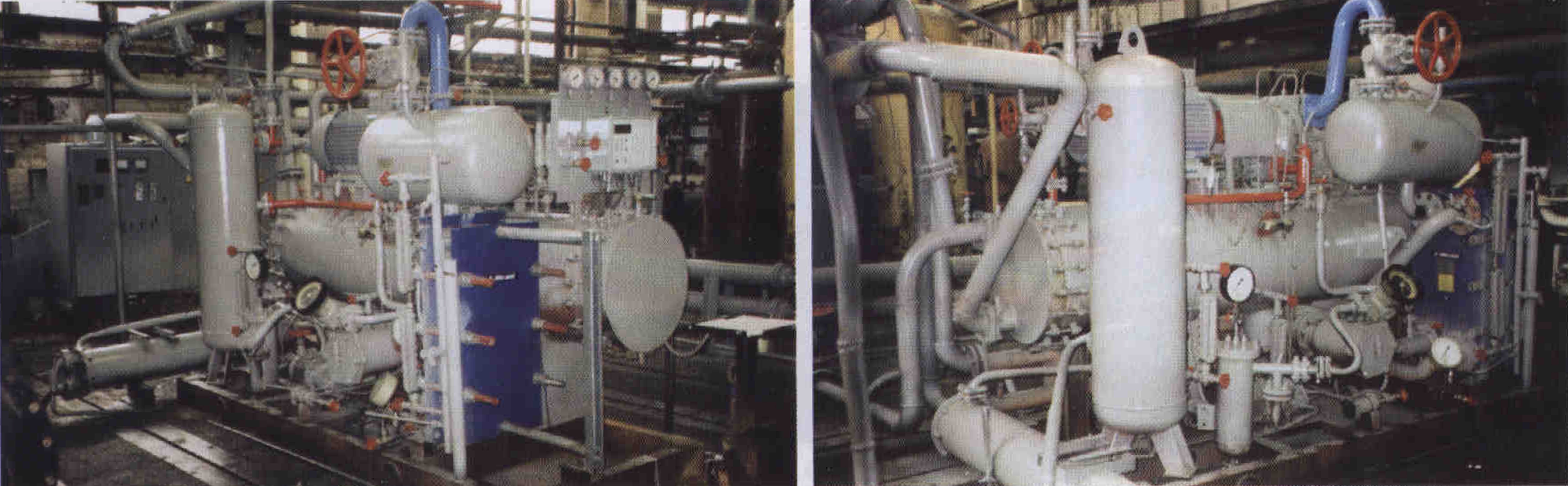 Машины 50МКТ280-7-1 и 50МКТ410-7-1 (3) комплектуются пластинчатыми полусварными конденсаторами, монтируемыми на общей раме с испарителями, поскольку использование кожухотрубных конденсаторов в этом случае значительно увеличивает габариты, металлоемкость и, главное, аммиакоемкость машины в целом.