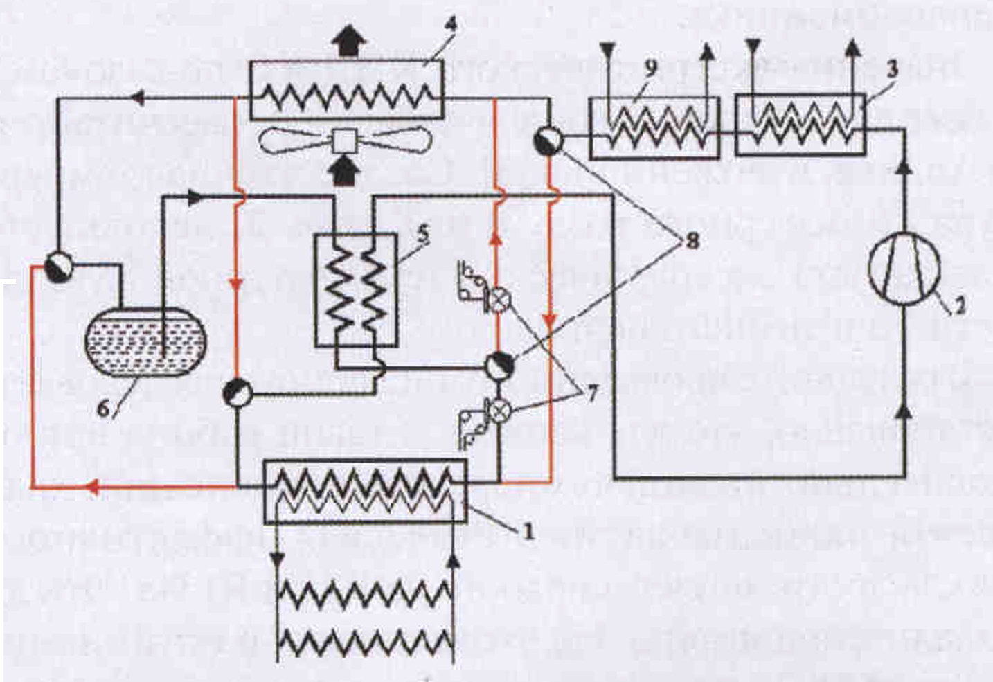 Рис. 2. Принципиальная тепловая схема обратимой МТХС: 1 — теплообменник рабочее вещество — теплоноситель (сетевая вода), работающий как испаритель в летний период и как конденсатор в зимний; 2 — одноступенчатый компрессор; 3 — теплообменник рабочее вещество - вода для ГВС; 4 — теплообменник рабочее вещество - воздух, работающий как воздушный конденсатор в летний период и как испаритель в зимний; 5 — регенеративный теплообменник; 6 — ресивер; 7 — регулирующая арматура; 8 — запорная арматура; 9 — дополнительный теплообменник-подогреватель технической воды