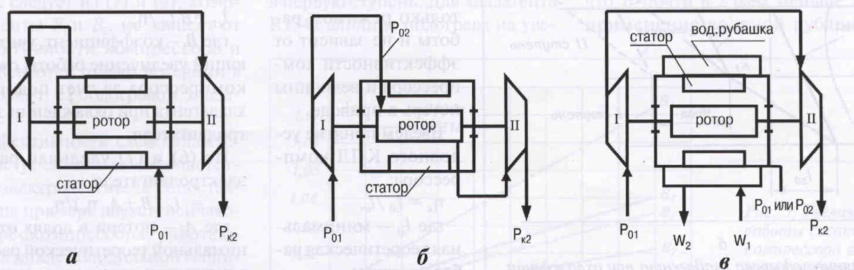 Рис. 1. Схемы охлаждения встроенного электропривода компрессора: а — парами хладагента с давлением всасывания в первую ступень; б — парами хладагента с давлением после первой ступени; в — водяной рубашкой