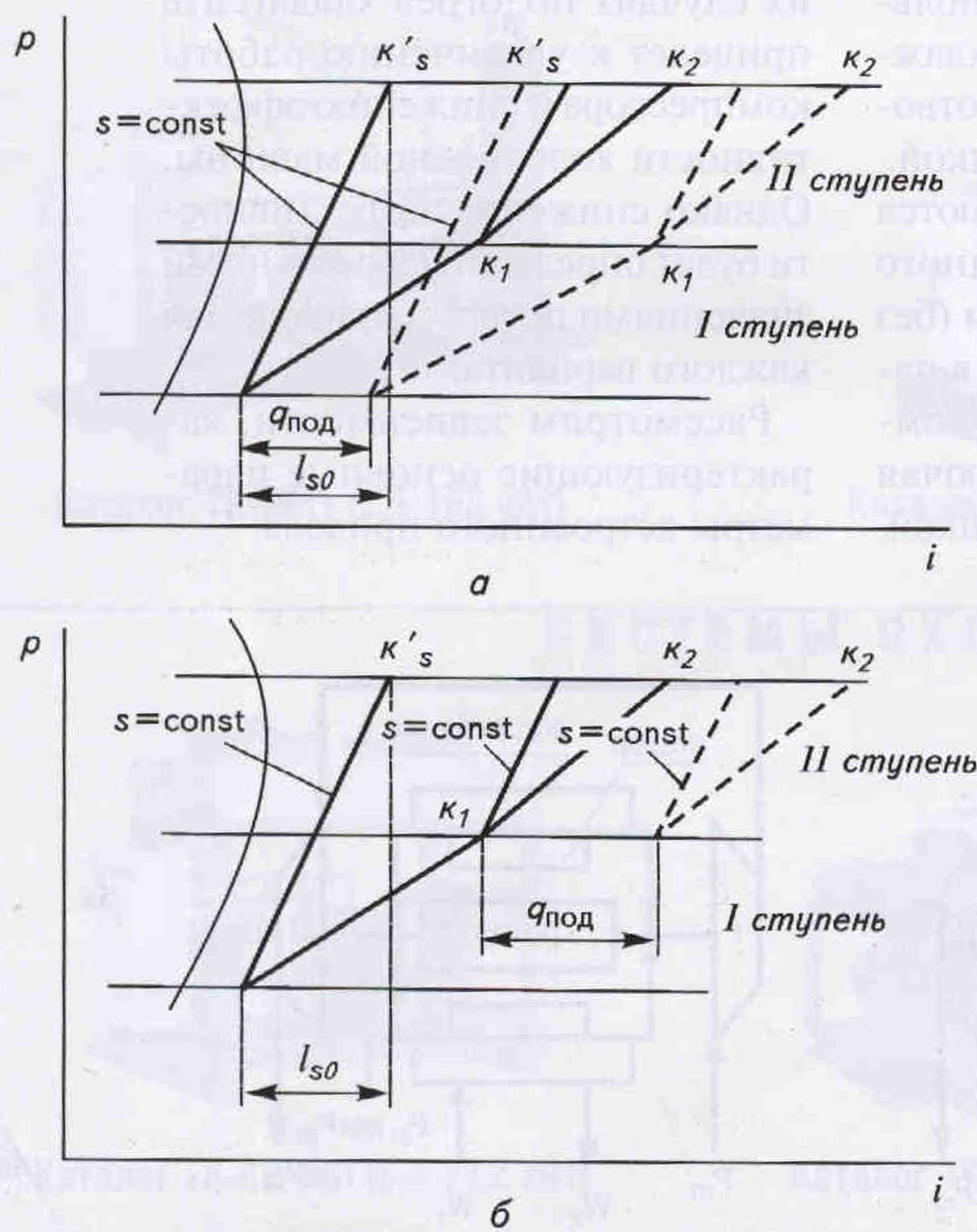 Рис. 2. Влияние подогрева хладагента при охлаждении привода на процесс сжатия в компрессоре: а — подогрев хладагента на входе в первую ступень; б — подогрев хладагента на входе во вторую ступень