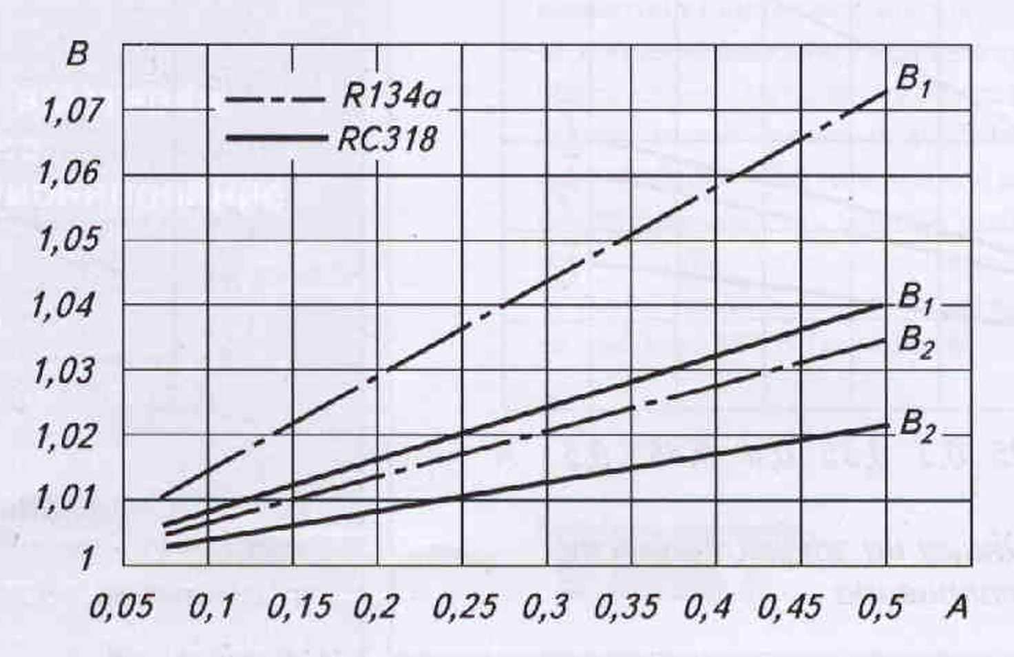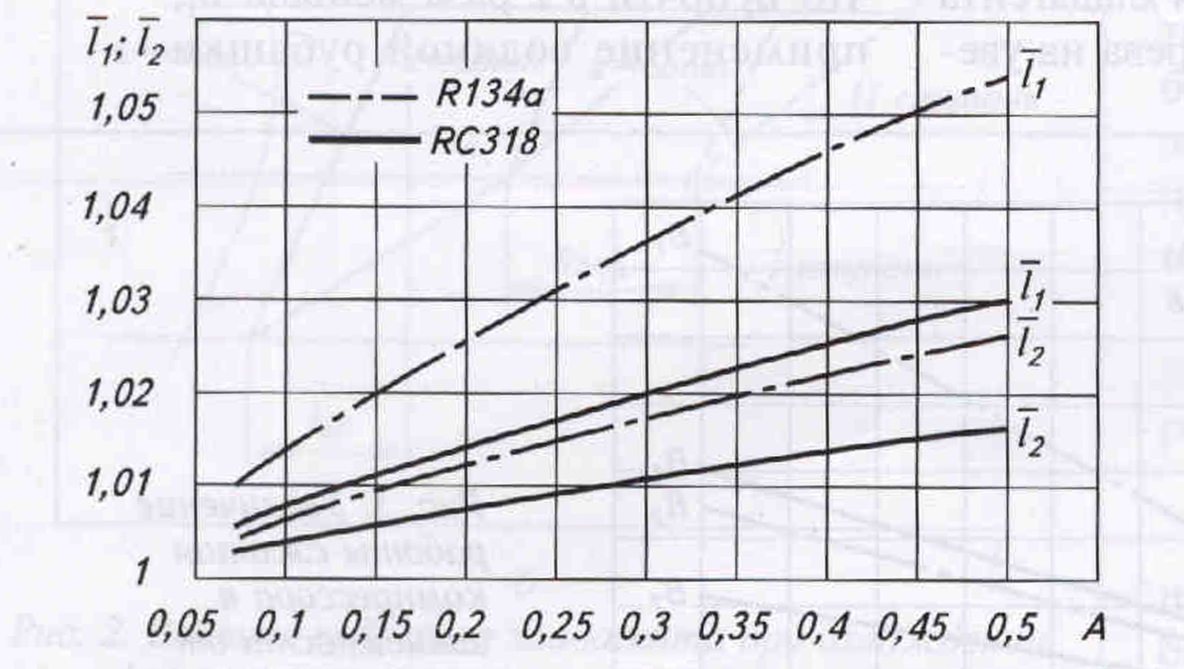 На рис. 3 показано изменение коэффициентов В1 и В2 для двух хладагентов при КПД ступеней, равных 0,7, что соответствовало условному КПД компрессора ηк=0,694. Как и следовало ожидать, прирост работы сжатия компрессора в случае охлаждения хладагентом с давлением р02 меньше, чем при охлаждении привода хладагентом с давлением всасывания в первую ступень. Для хладагента R134a влияние подогрева на увеличение работы сжатия компрессора при одинаковых значениях коэффициентов A1 и А2 больше, чем для RC318. Это связано с тем, что для рассматриваемого режима адиабатная работа сжатия компрессора на хладагенте R134а оказывается выше, что при одинаковом значении коэффициента А приводит к различной абсолютной величине потерь в приводе и, следовательно, к разной величине подогрева.