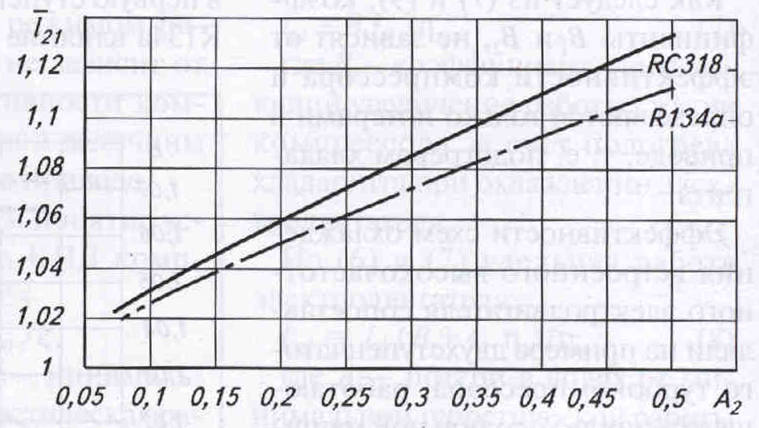 На рис. 5 представлены результаты расчета по зависимости (14) для этих значений d. Полученный результат в отличие от вывода работы [1] показывает, что компрессор с охлаждением встроенного привода парами хладагента с давлением всасывания в первую ступень будет всегда более эффективен. При высоком уровне потерь (А2=0,35...0,5) повышение эффективности компрессора может достигать 10-13%, причем для R134a оно меньше, чем для RC318, из-за меньшего изменения плотности. При снижении А2 до 0,1 и ниже выигрыш уменьшается до 3%.