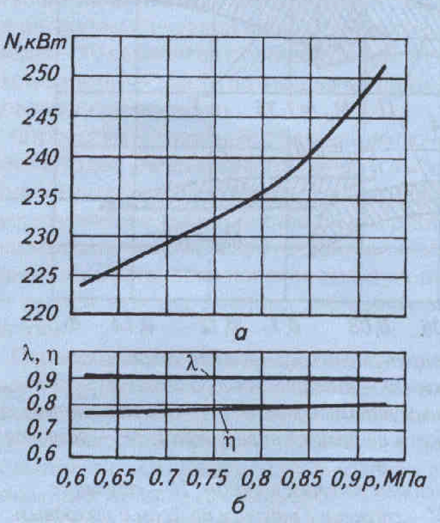 Рис. 1. Зависимость потребляемой эффективной мощности N (а), коэффициента подачи Л и эффективного адиабатного КПД (8) винтового компрессора компрессорной станции 188-40/9 от давления нагнетания р (абсолютное)