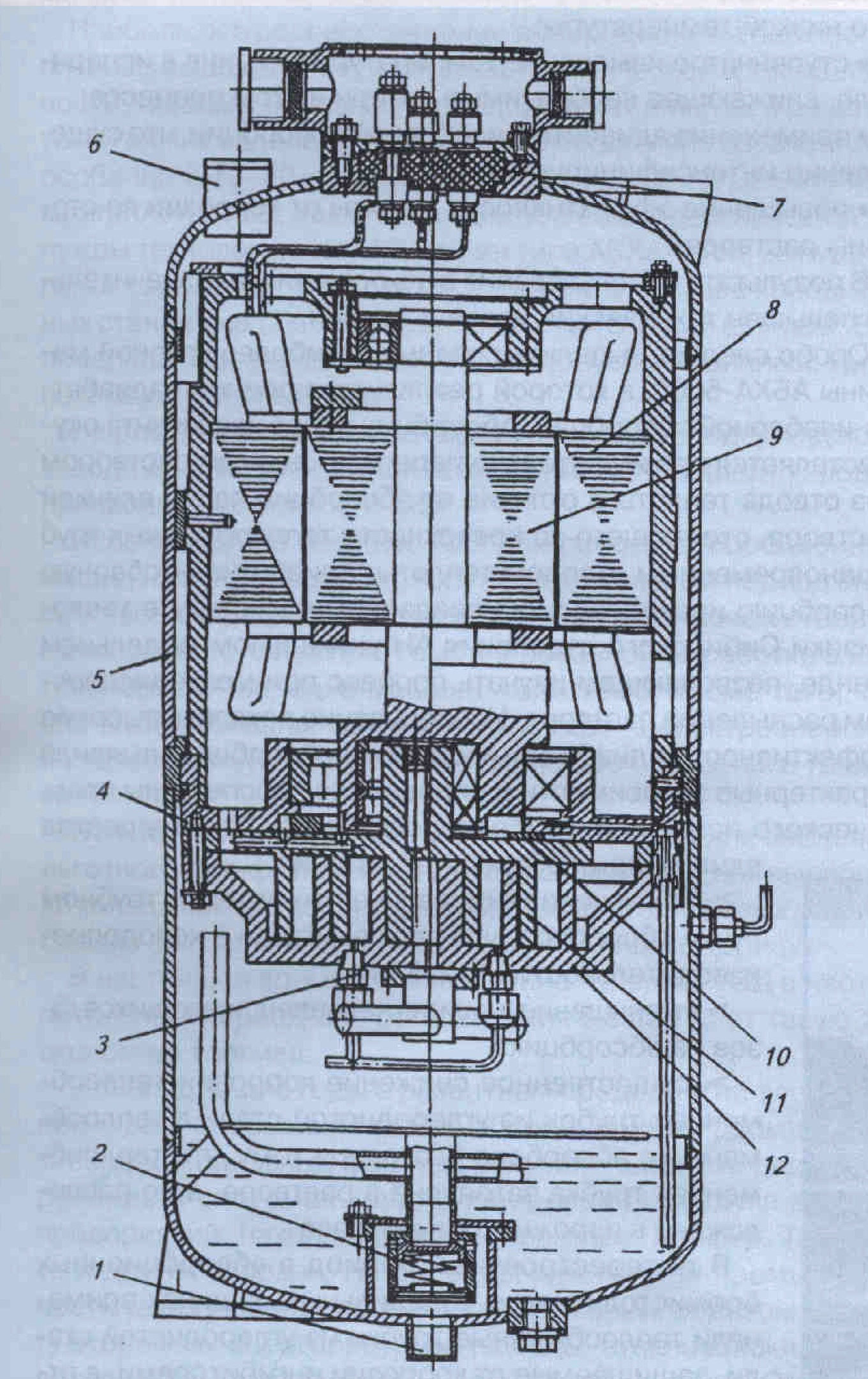 Рис. 2. Спиральный компрессор СК 16: 1 — нагнетательный патрубок; 2 — обратный клапан; 3 — коллектор впрыска хладагента; 4 — проставка; 5 — корпус; 6 — всасывающий патрубок; 7—клеммник; 8 — статор электродвигателя; 9 —ротор; 10 — муфта Ольдгейма; 11 — подвижная спираль; 12 — неподвижная спираль