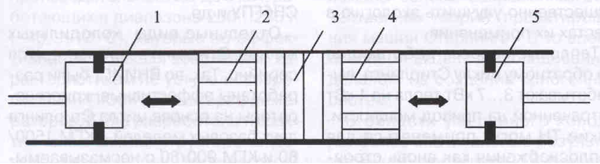 Принципиальная схема машины Стирлинга: 1 — рабочий поршень; 2 — холодильник; 3 — регенератор; 4 — теплообменник нагрузки; 5 — поршень-вытеснитель
