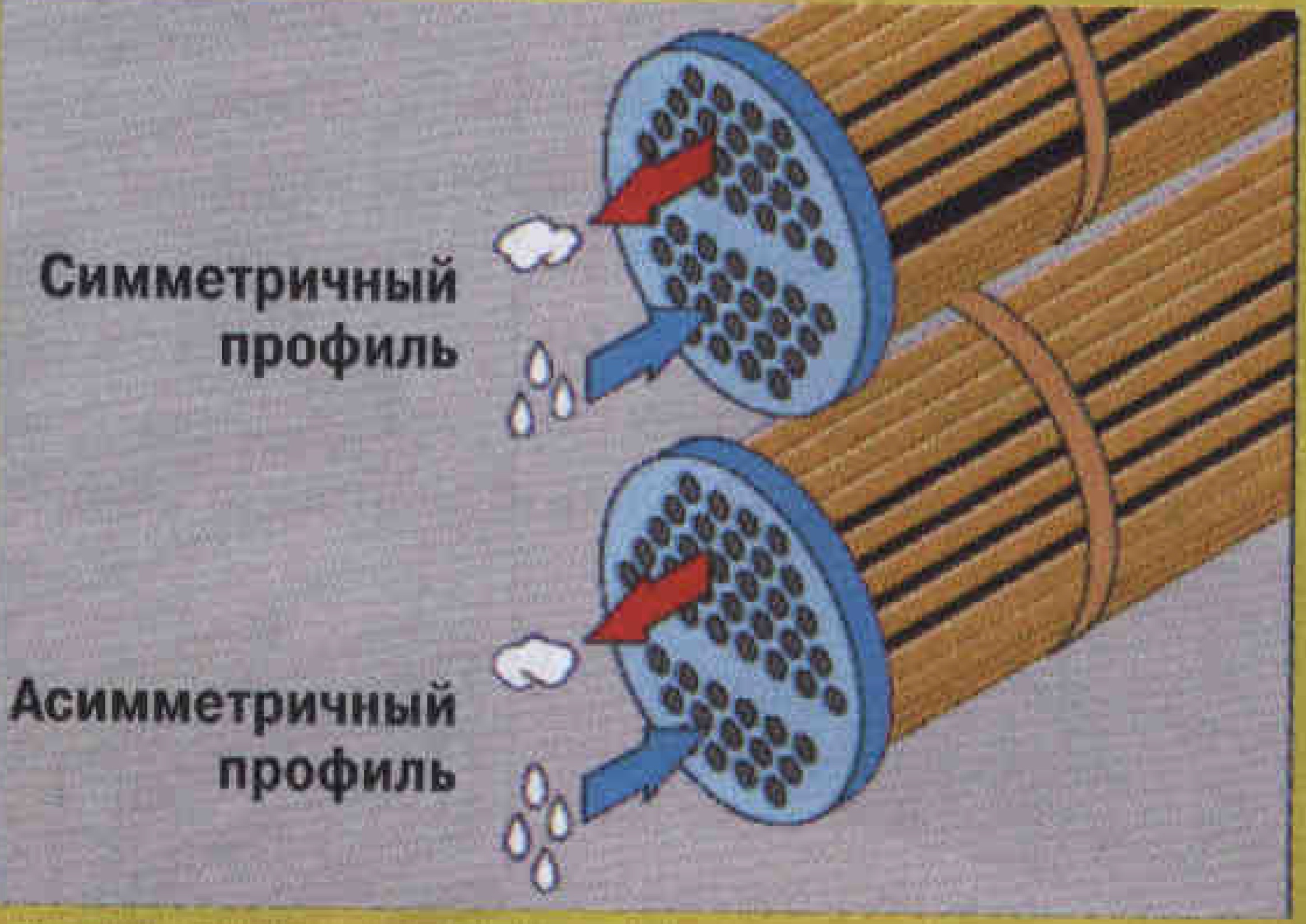 Первое из этих решений - применение асимметричного профиля размещения пучков труб в кожухотрубных испарителях (рис. 2). Количество труб в верхней и нижней частях аппарата неодинаково, что способствует интенсификации теплообмена. Так как в нижней части находится жидкий хладагент, а в верхней - образующийся по мере развития процесса кипения парообразный хладагент, объем которого на порядок больше, чем жидкого, асимметричный профиль при водит к увеличению скорости движения хладагента, а также большей турбулизации его потока.