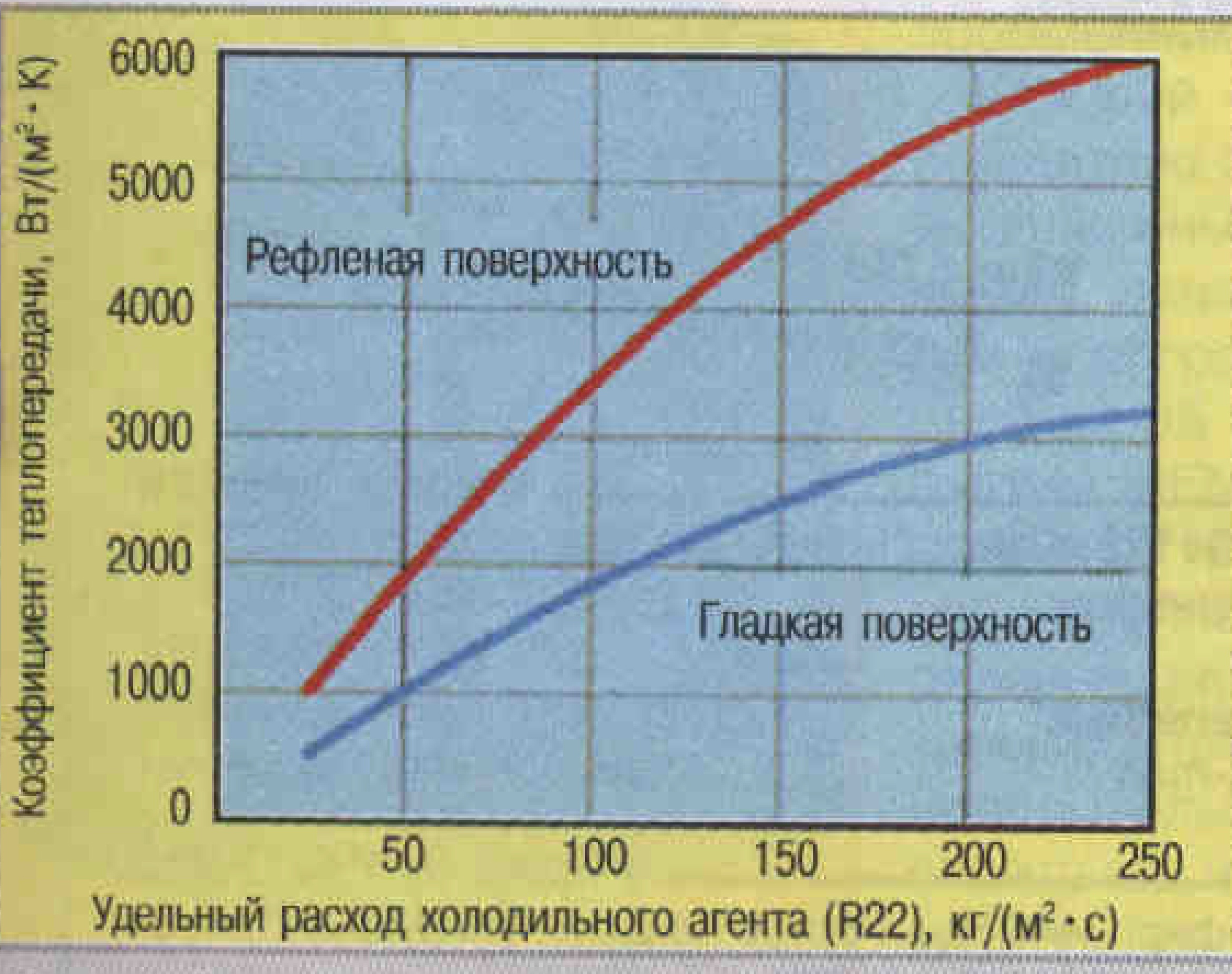 На рис. 4 представлены графики зависимости коэффициента теплопередачи от удельного расхода хладагента для труб со специальным профилем внутренней поверхности и с гладкой внутренней поверхностью. Как видно из графиков, повышение коэффициента теплопередачи для труб со специальным профилем по сравнению с гладкими трубами составляет более 100 %. Это позволило существенно увеличить значения холодильного коэффициента и в конечном итоге снизить энергопотребление чиллеров, в которых используются испарители со специальным профилем внутренней поверхности труб.