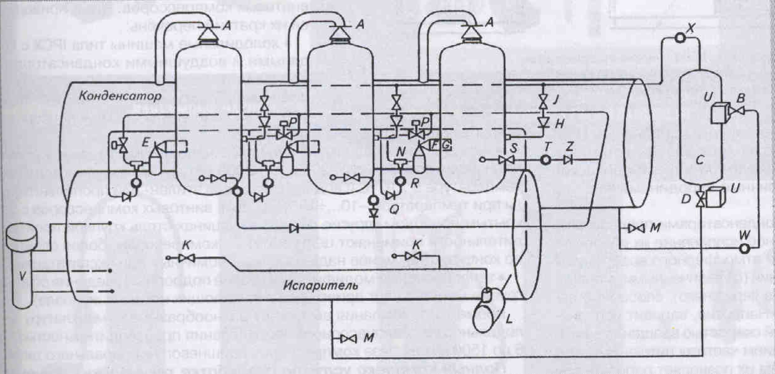 Необходимый уровень хладагента в испарителе поддерживается поплавковым регулятором V, причем дросселирование хладагента происходит в два этапа при помощи двух заслонок с электрическим приводом, синхронно работающих по команде поплавкового регулятора. После первого дросселирования парожидкостная смесь попадает в вспомогательный сосуд С, откуда пар хладагента направляется в полость промежуточного давления компрессора, а жидкий хладагент - на второе дросселирование. Предусмотрена специальная линия для возврата масла из испарителя в компрессор. В обечайке испарителя на вы соте несколько ниже расчетного уровня хладагента предусмотрен ряд отверстий, через которые с помощью инжектора N не большое количество хладагента, обогащенного маслом, направляется во всасывающий трубопровод. В машинах с несколькими компрессорами хладагент высокого давления подается в инжектор N через уравнительную линию с обратным клапаном Z.