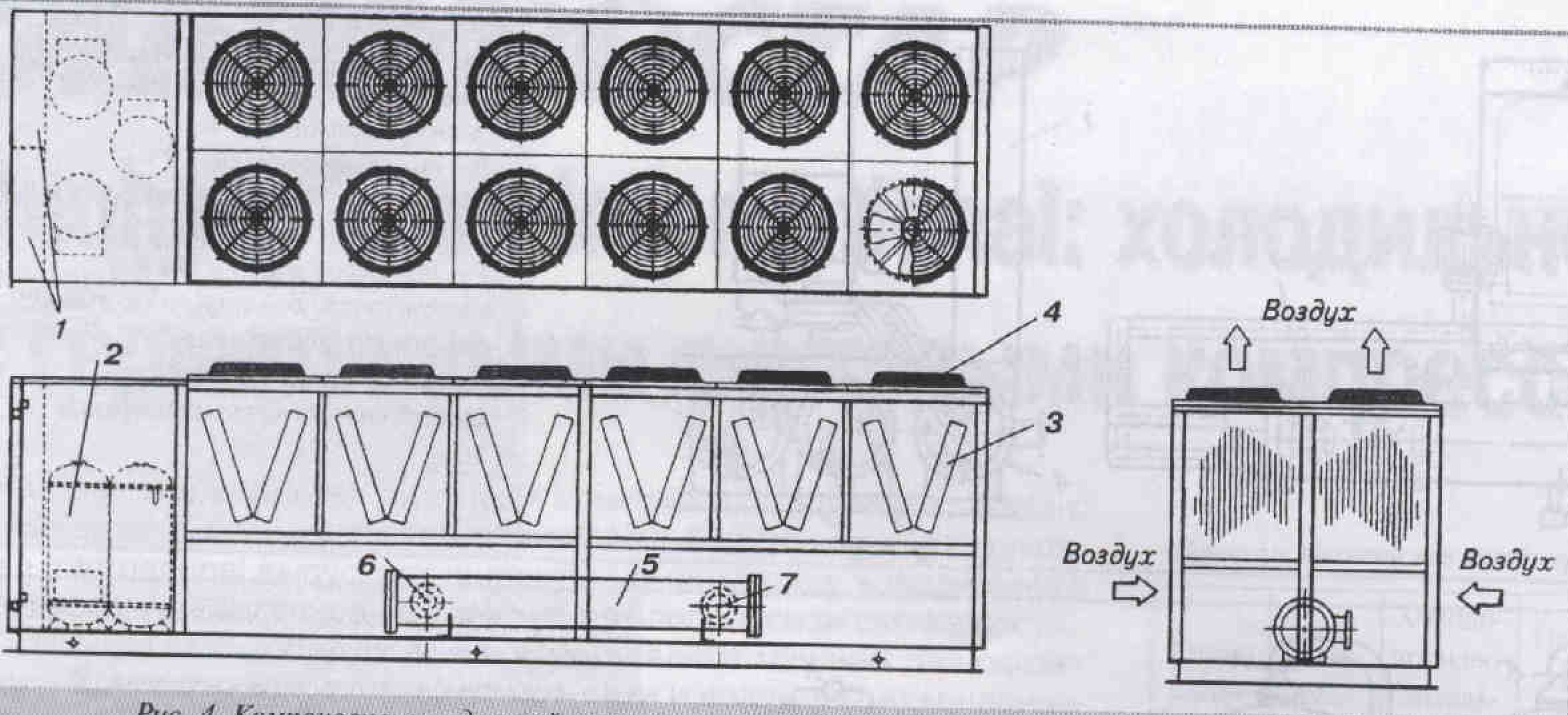Диапазон холодопроизводительности этих машин 150... 1940 кВт (табл. 2). Воздушные конденсаторы изготовлены из медных труб диаметром 9,5 или 12,7 мм и пластинчатых гофрированных алюминиевых ребер, закрепленных методом дорнирования. Расположение труб в пучке шахматное. Батареи конденсатора испытывают на заводе-изготовителе под давлением 3,1 МПа. Конденсаторный блок состоит из отдельных секций, со бранных в V-конфигурацию с размещением осевых вентиля торов в верхней части. Вентиляторы имеют непосредственный привод от электродвигателя влагоморозостойкого исполнения. Применение штампованных диффузоров позволяет обеспечить минимальный равномерный зазор между крыльчаткой и цилиндрической частью диффузора, что гарантирует отличные аэродинамические и акустические показатели.